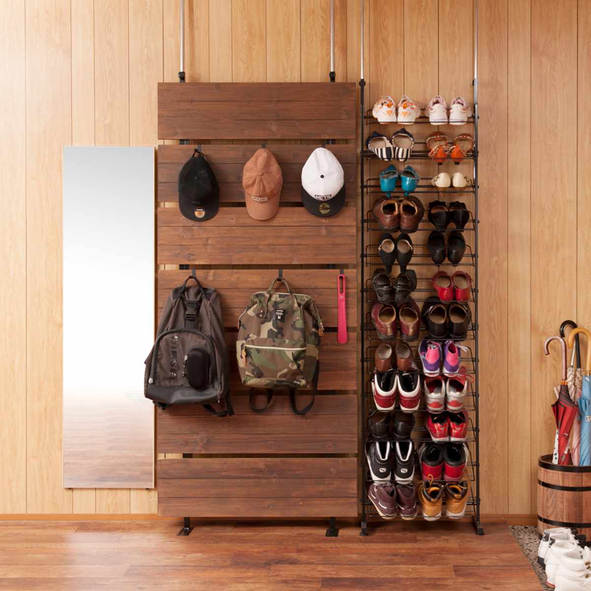 突っ張り ウォールパーテーション 幅86cm フック6個付 天然木 日本製 ( 壁面収納 ウォールラック つっぱり 突っ張り式 ラック フック付 壁面 収納 壁面ラック 突っ張りラック パーテーション 省スペース )