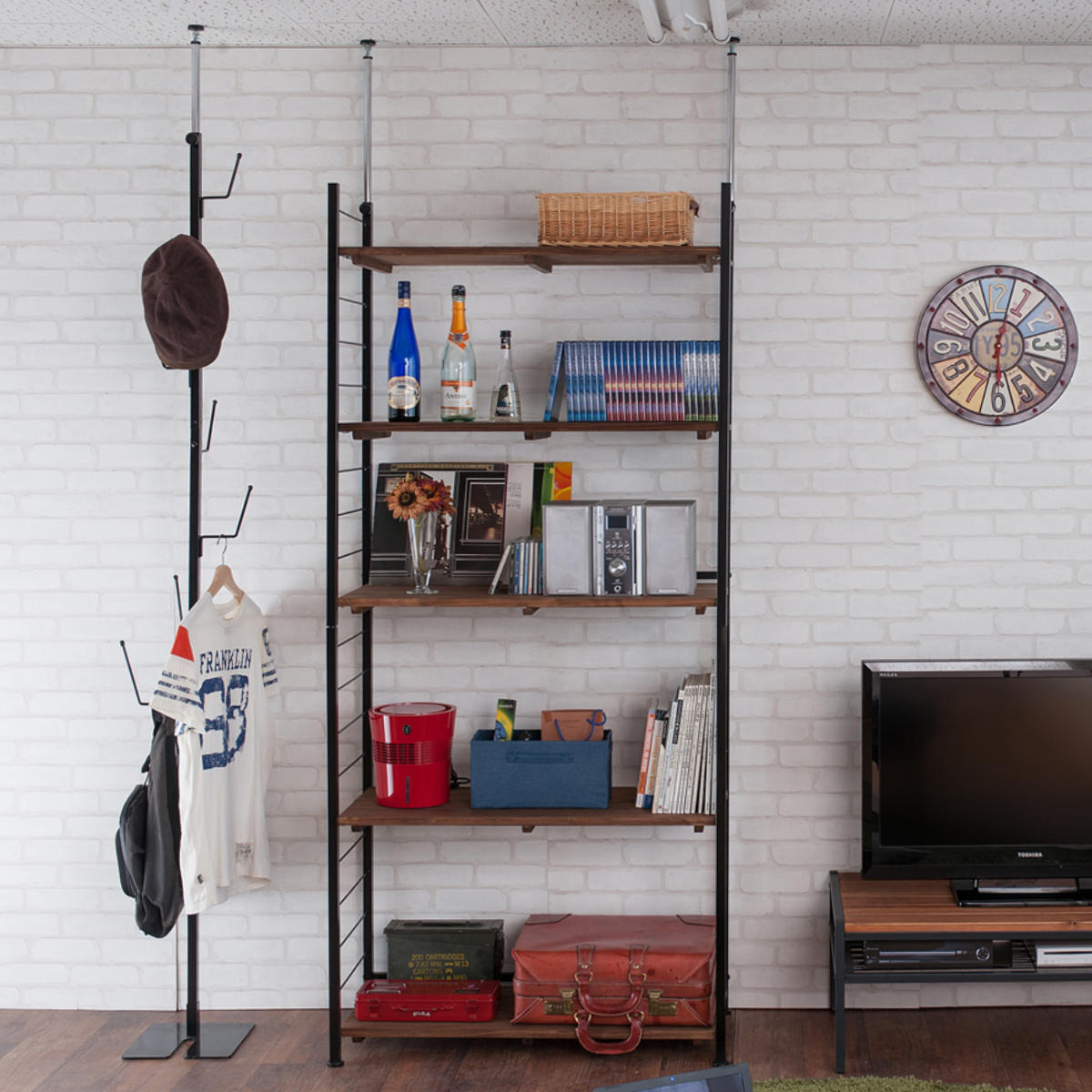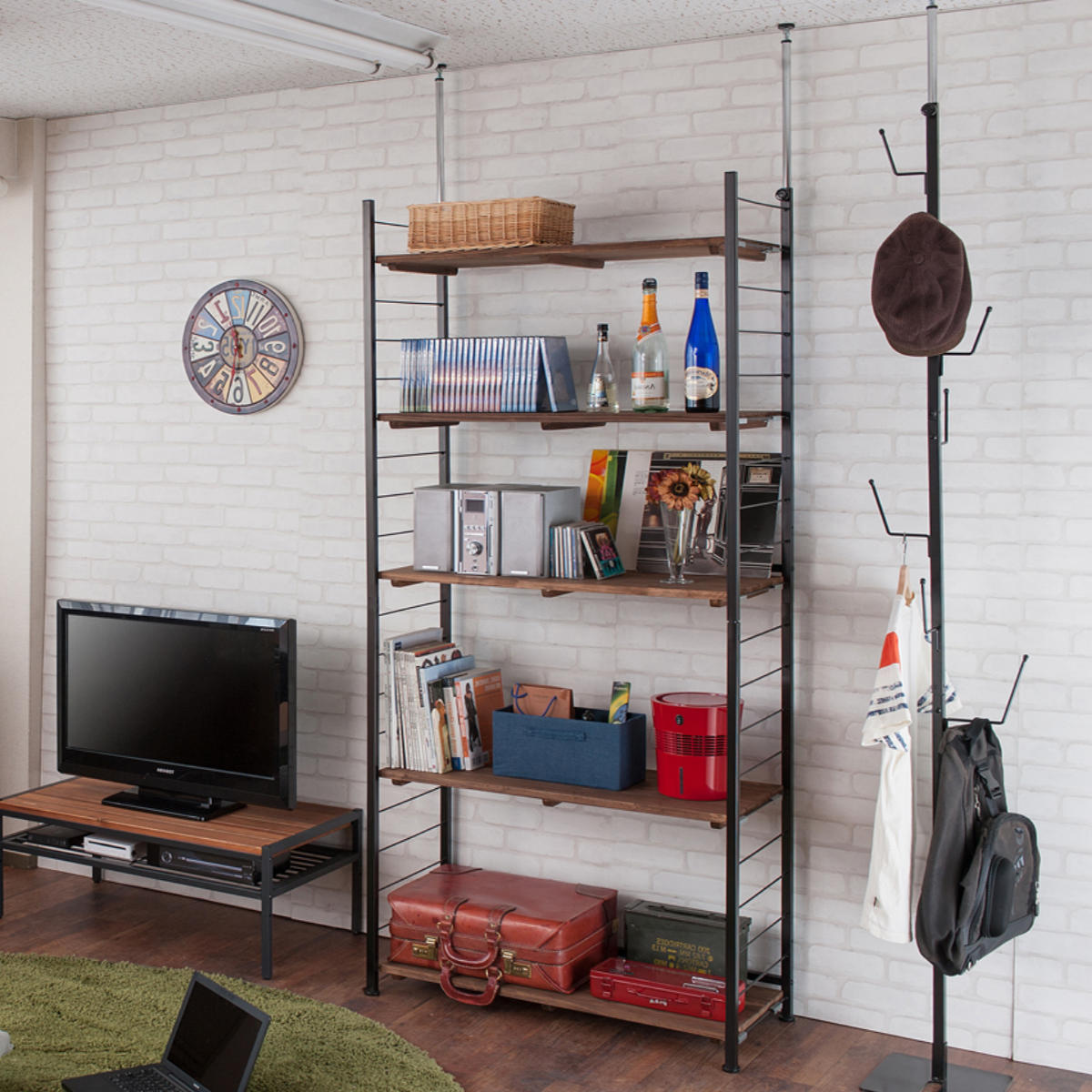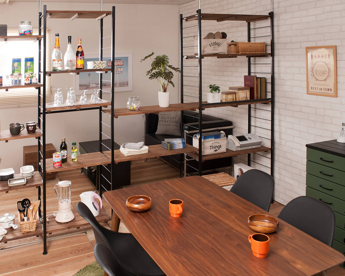 雰囲気のある古木を使って作られたような壁面収納「オープンラックタイプ」です。工事不要で簡単に設置できる突っ張り式なので、賃貸のお部屋にお住まいの方にもおすすめです。マットなブラックスチールと天然杉の棚板がヴィンテージ感漂う空間を作り出します。