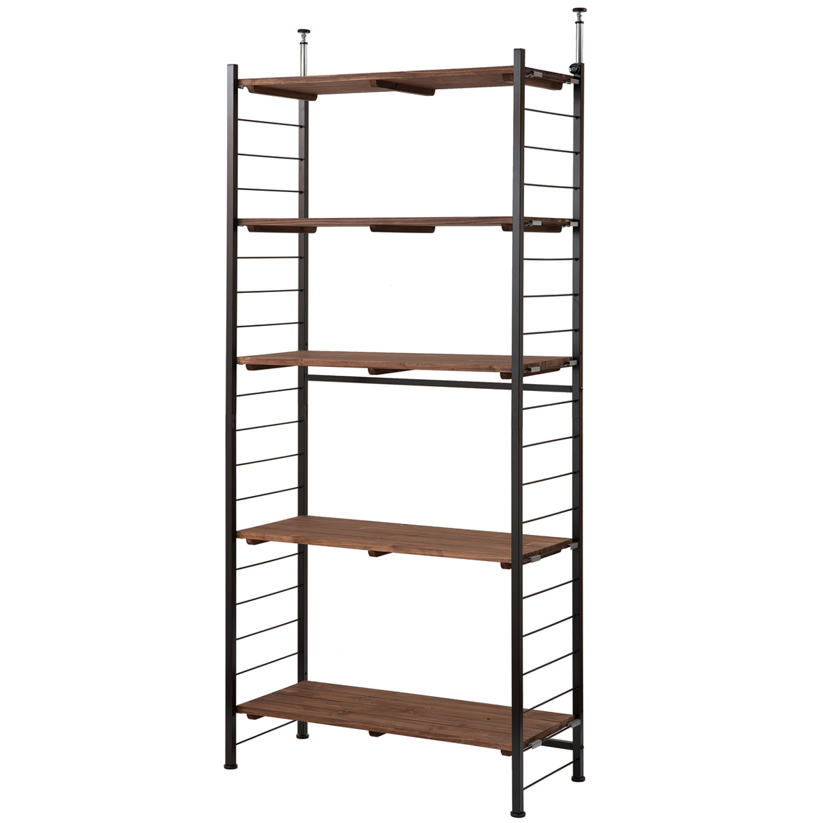 | しっかり突っ張るから安心 つまみを緩めてスライドバーを天井に伸ばして突っ張ります。付属のスパナでしっかりと天井に固定します。 | ガタつき防止のアジャスター付 脚部はアジャスター付きで、床の傾きや凸凹によるガタツキを軽減することができます。 |