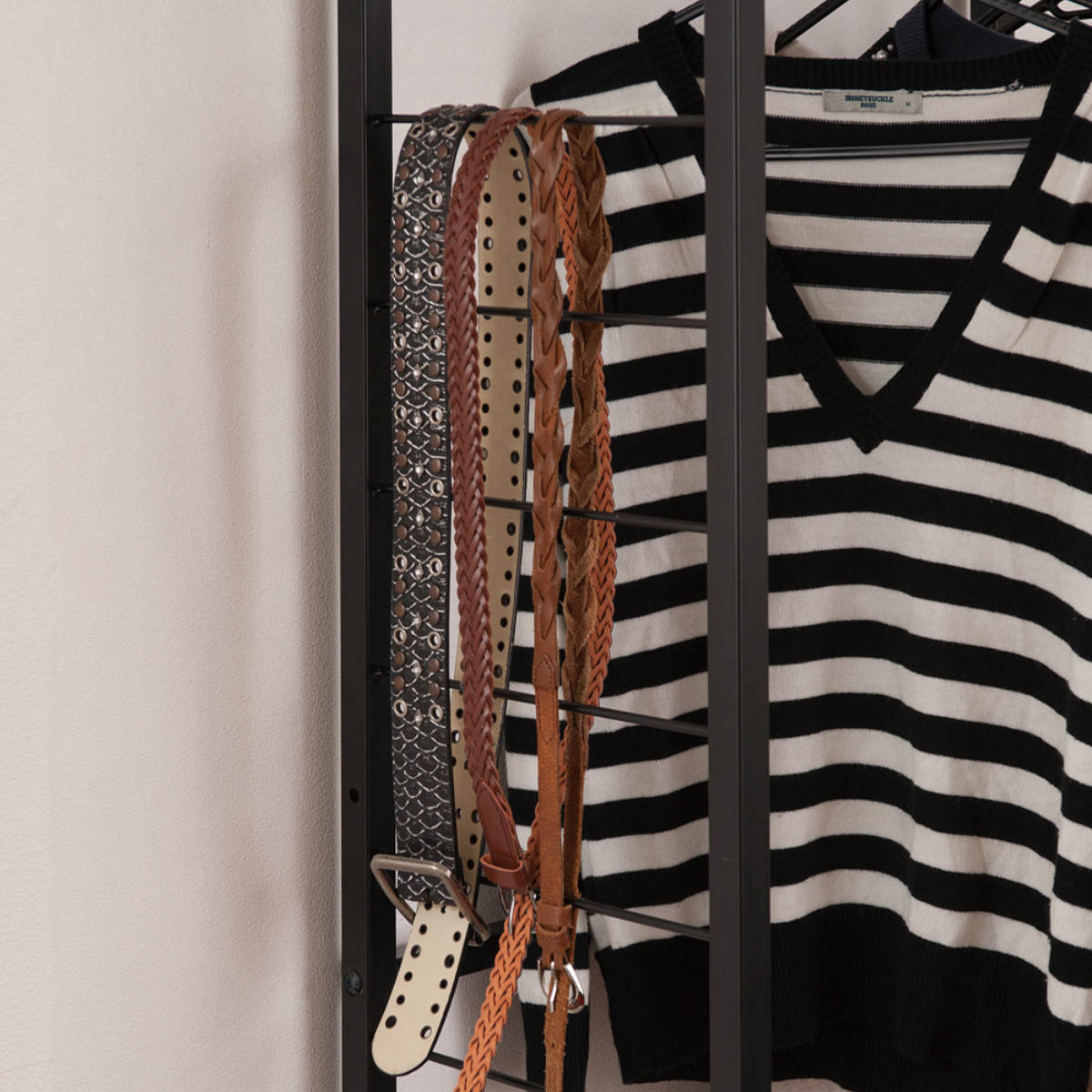 棚板のヴィンテージ感に合わせて、フレームにもマットな仕上げを施しています。2cm角の極太パイプを使用したフレームは、高品質で頑丈な日本製です。サイドフレームには、ベルトやバッグなどを掛けることができます。