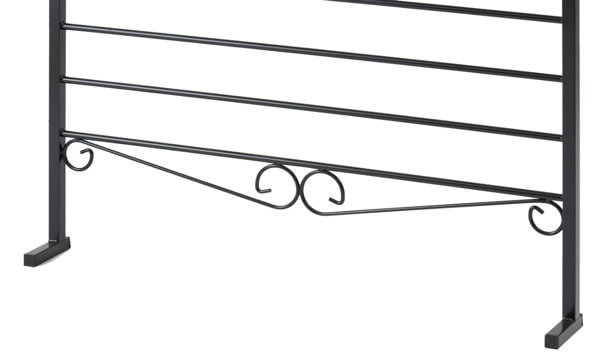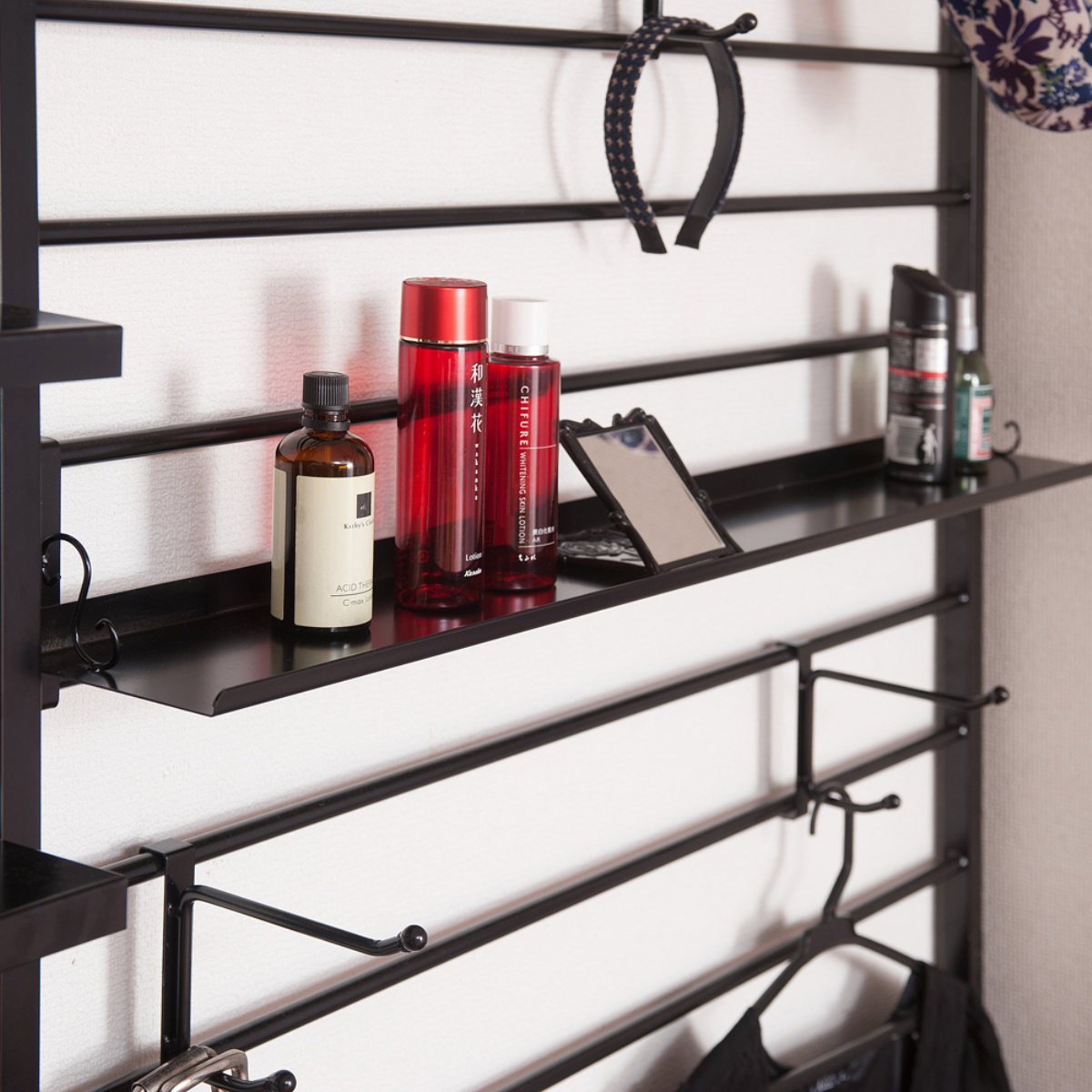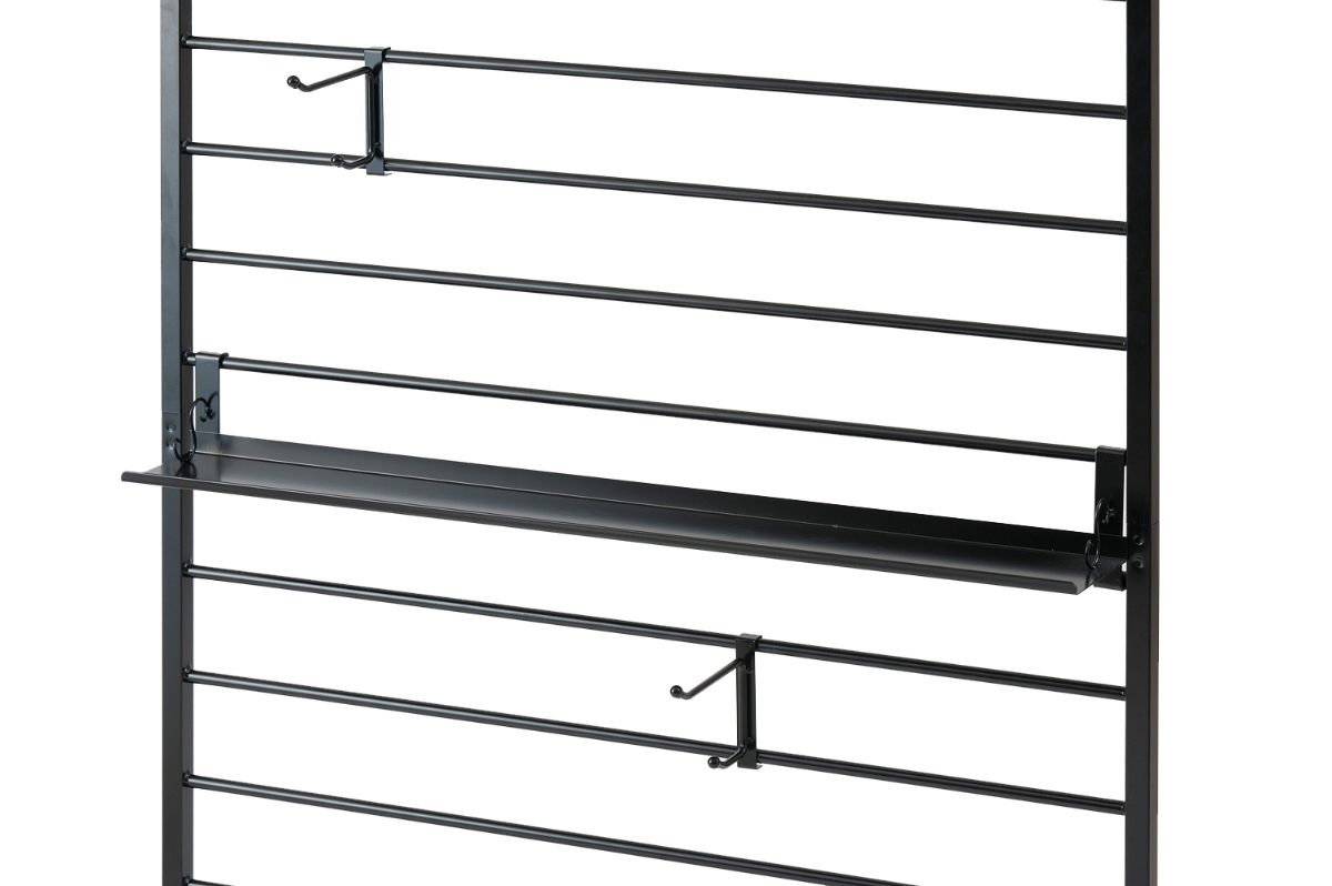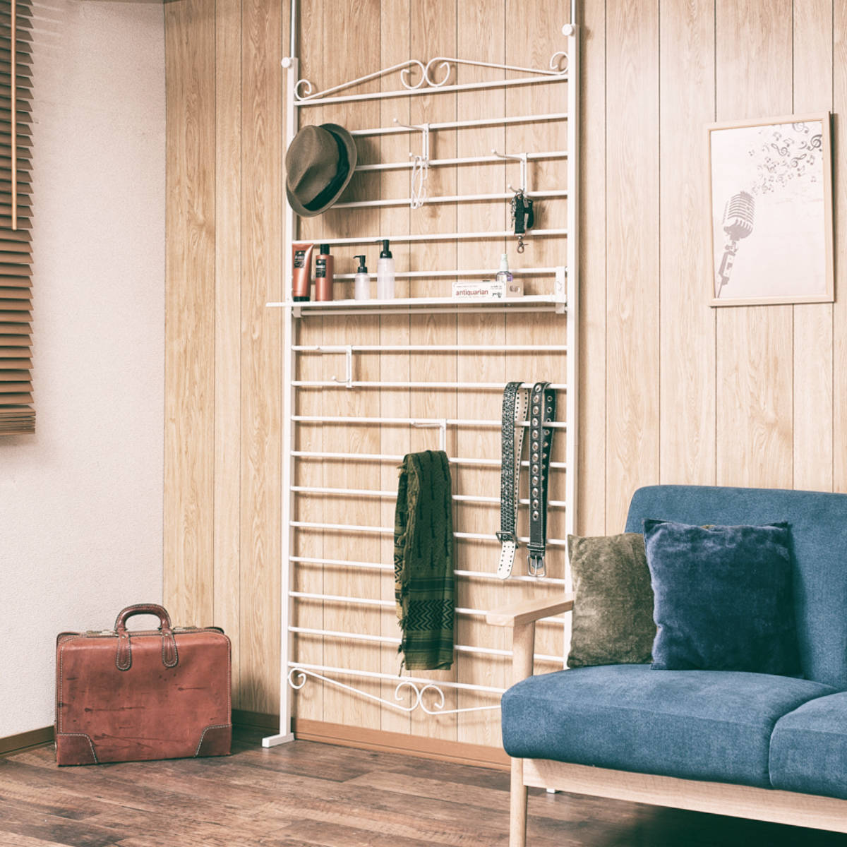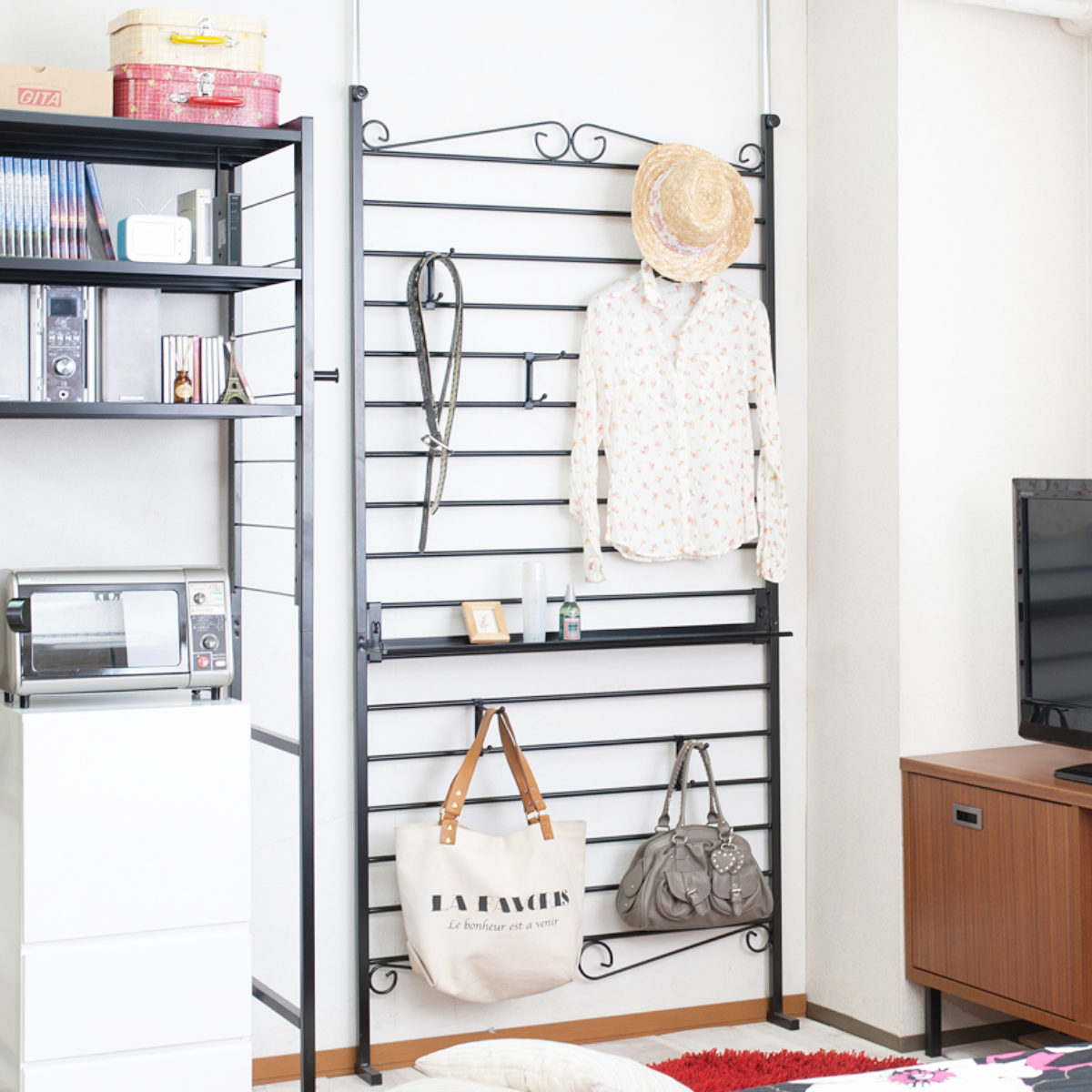 壁面収納としてだけではなく、お部屋の間仕切りとしてもご使用いただけます。スチール製のラダーは、圧迫感を与えずに空間を仕切ることができます。付属のフックや棚は両面に掛けられます。