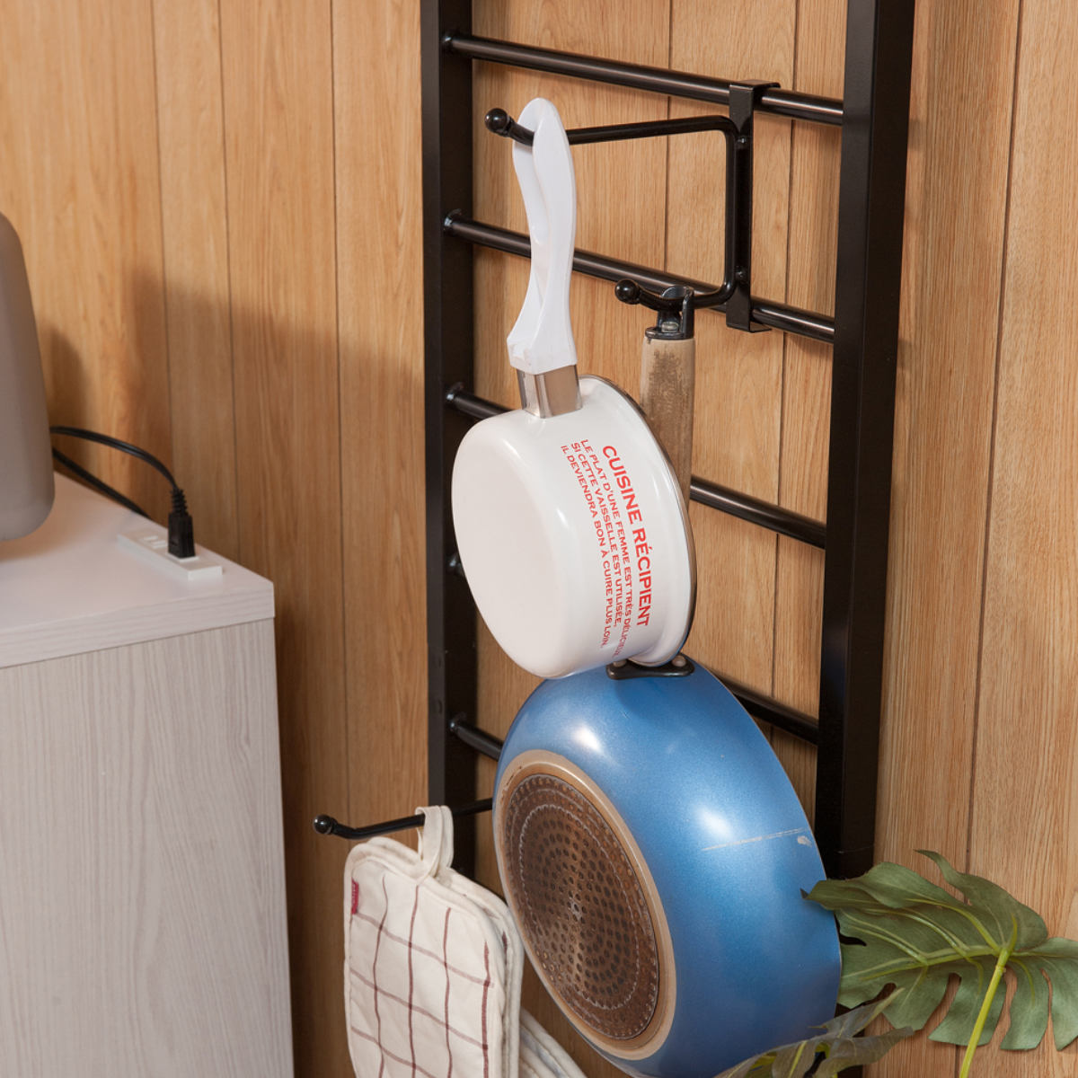 フライパンやハンガーなどを掛けられる、上下ダブルフックが5個付いています。ラダー部分の好きな場所に移動できます。