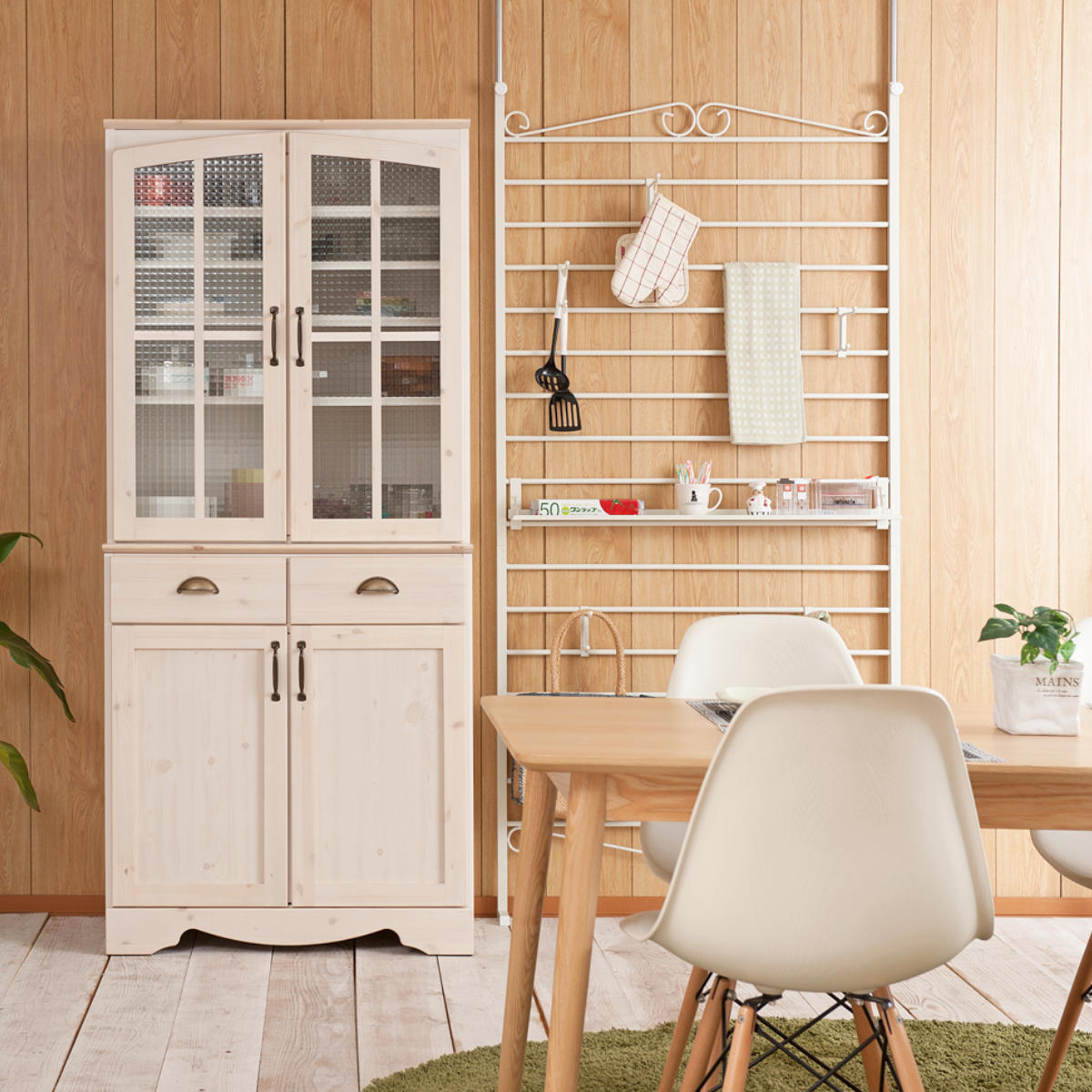 鍵や一輪挿しを置いたり、絵をディスプレイできる棚が1枚付いています。前後のフチが立ち上がった仕様なので、置いたものが落ちにくく安心です。また、両サイドにもカールデザインが施されており、こちらもストッパーとしても役立ちます。