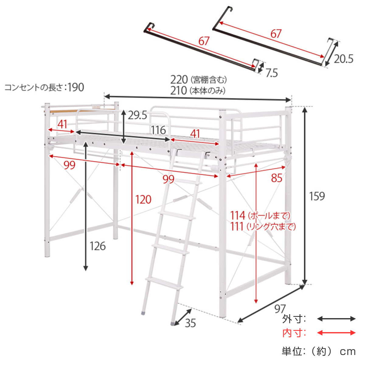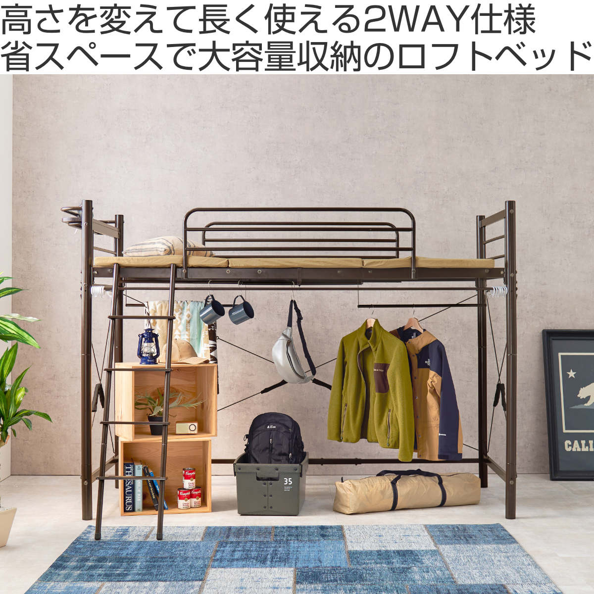 ロフトベッド シングル ミドルタイプ カーテン取付可能 2口コンセント付 2WAY ( ベッド 低め カーテンレール付 コンセント付 シングルベッド ロフト 宮棚 耐荷重100kg ハンガーポール付 収納 ) 【ダークブラウン】