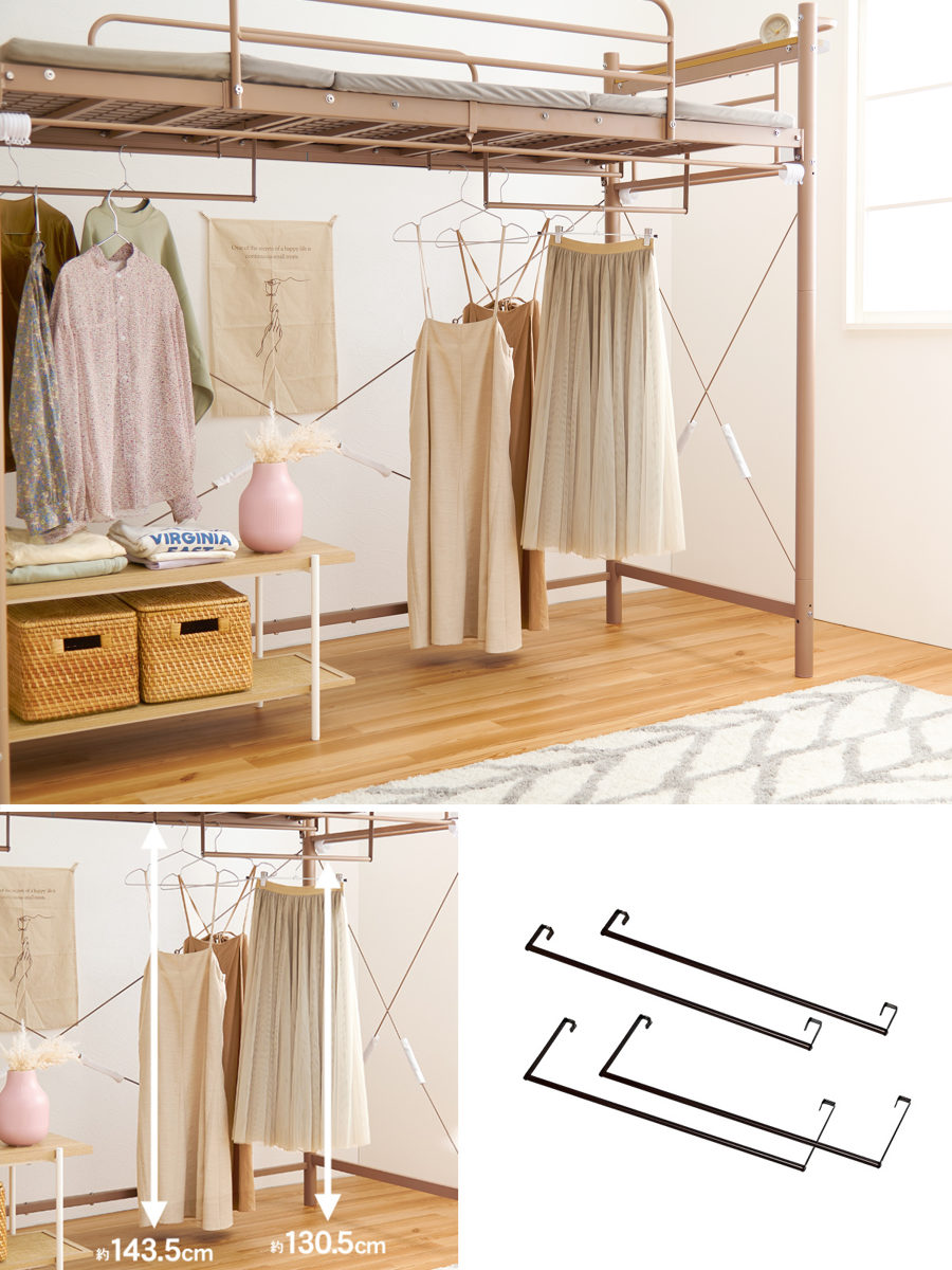 ハンガーポール付きなので、ベッド下のスペースをクローゼットのように使うことができます。短いポール2本、長いポール2本の合計4本のポールが付属しています。トップスやスカート、ジーンズなどを掛けるのに最適な高さです。
