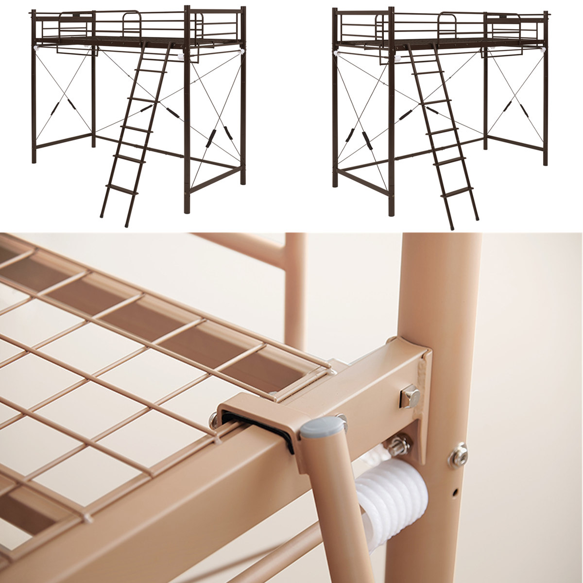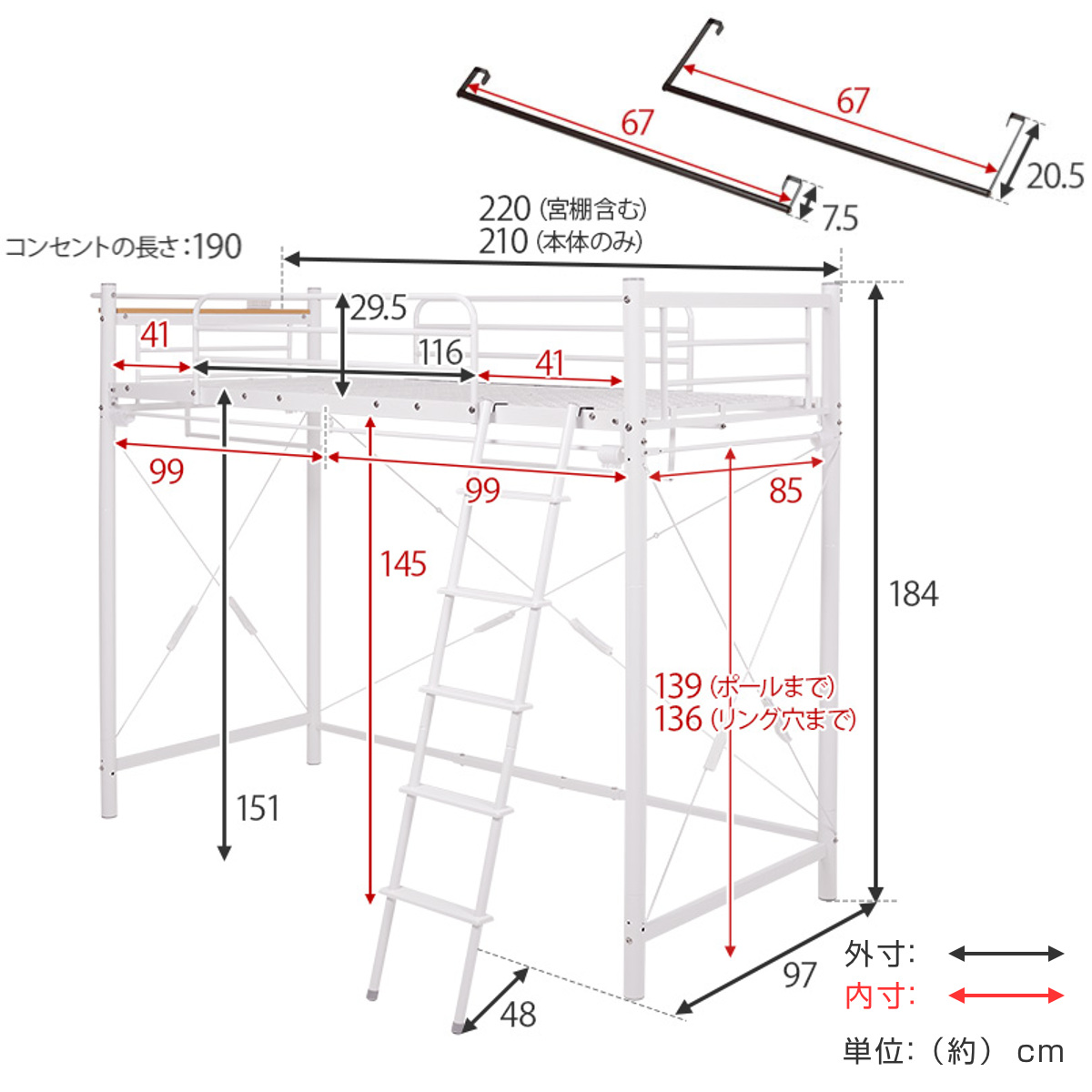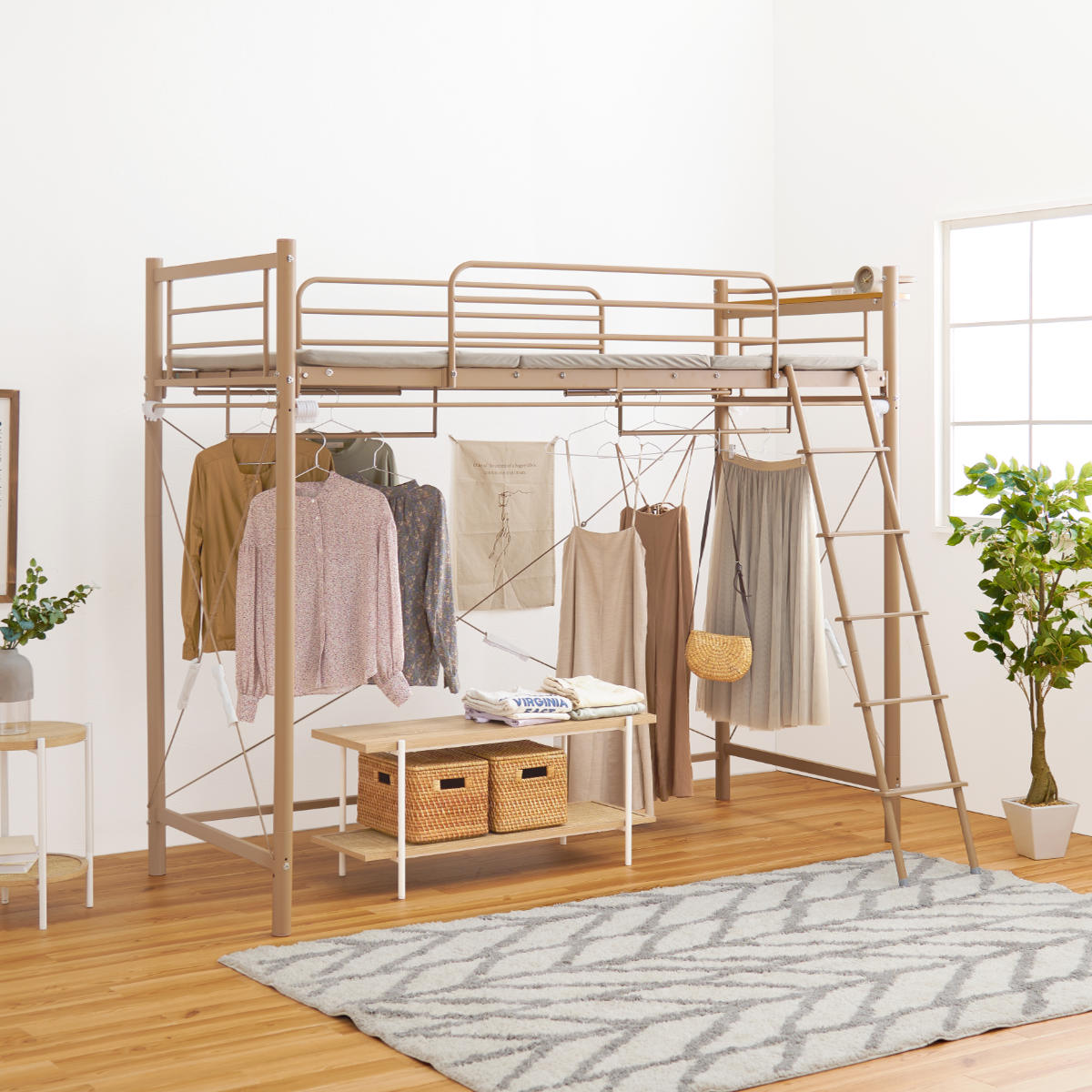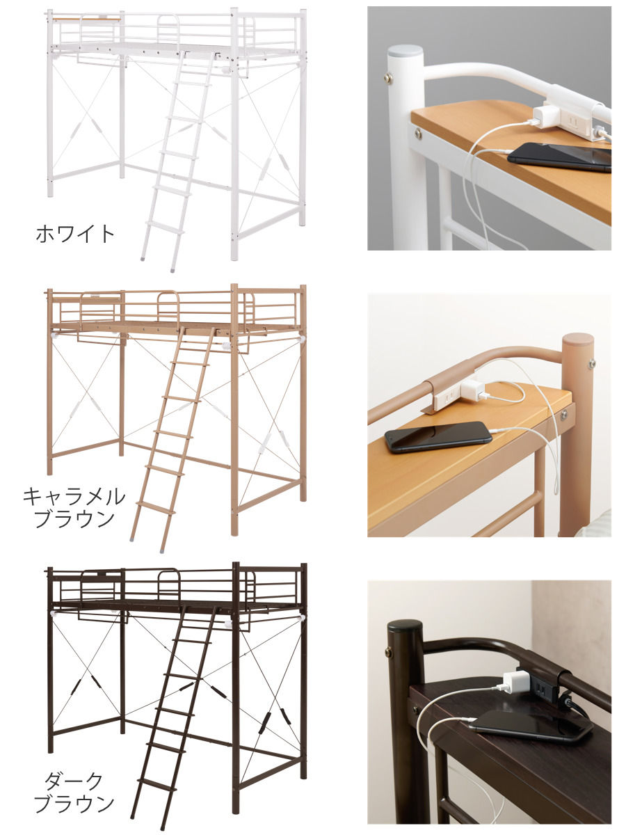 ロフトベッド シングル ハイタイプ カーテン取付可能 2口コンセント付 2WAY ( ベッド 高め カーテンレール付 コンセント付 シングルベッド ロフト 宮棚 耐荷重100kg ハンガーポール付 収納 ) 【キャラメルブラウン】