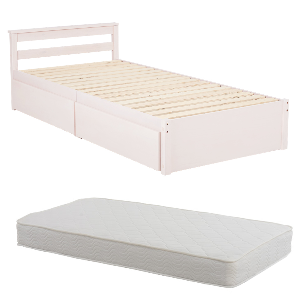 引出し付ベッド シングル ポケットコイルマットレス付 天然木 すのこ 耐荷重200kg ( ベッド マットレス付 収納付 引出し 2杯 圧縮梱包 ベッドフレーム 棚付 ライトブラウン ナチュラル ホワイトウォッシュ ) 【ホワイトウォッシュ】