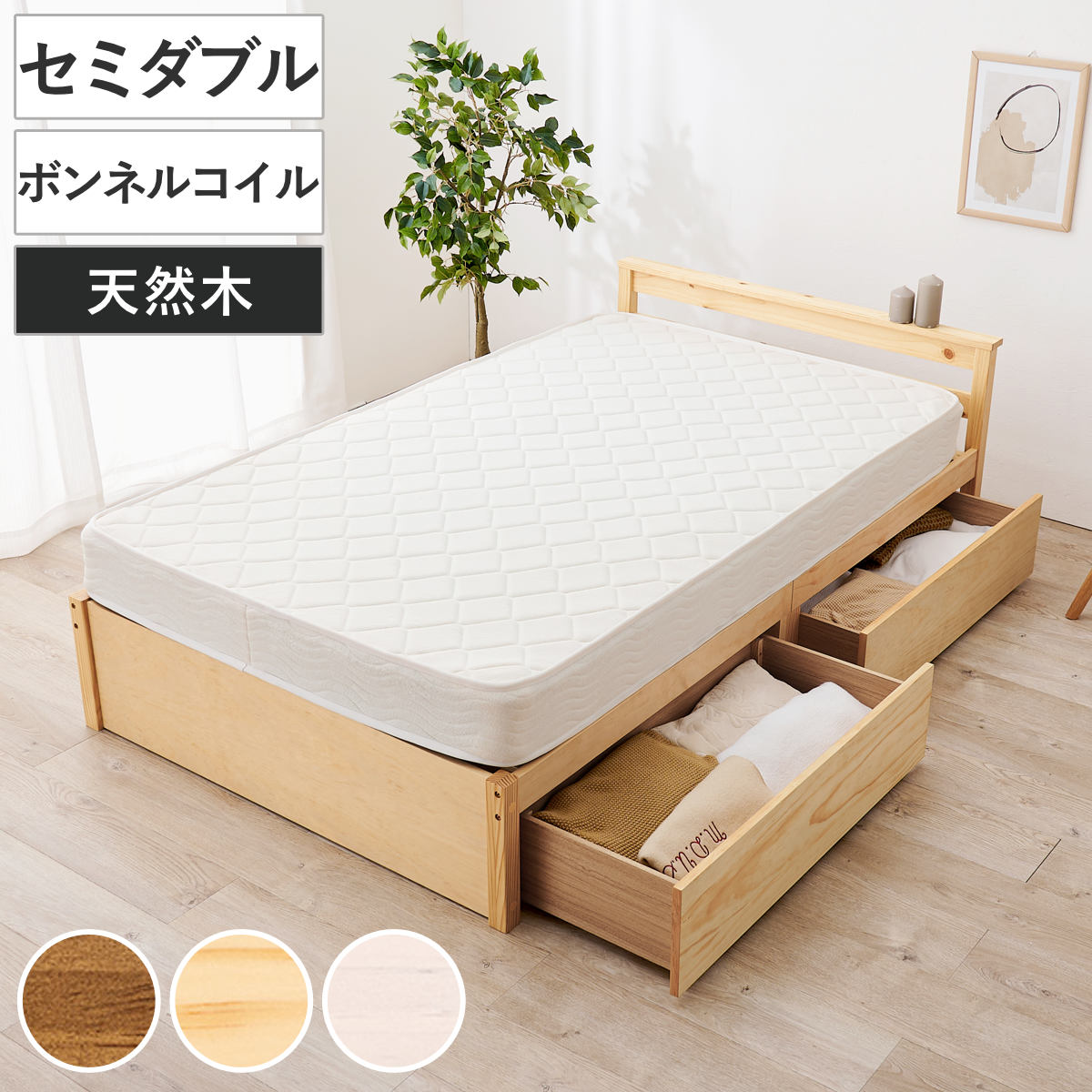 引出し付ベッド セミダブル 天然木 すのこ 耐荷重200kg ( ベッド 収納付 引出し 2杯 寝具 ベッドフレーム 棚付 ライトブラウン ナチュラル ホワイトウォッシュ ) 【ライトブラウン】