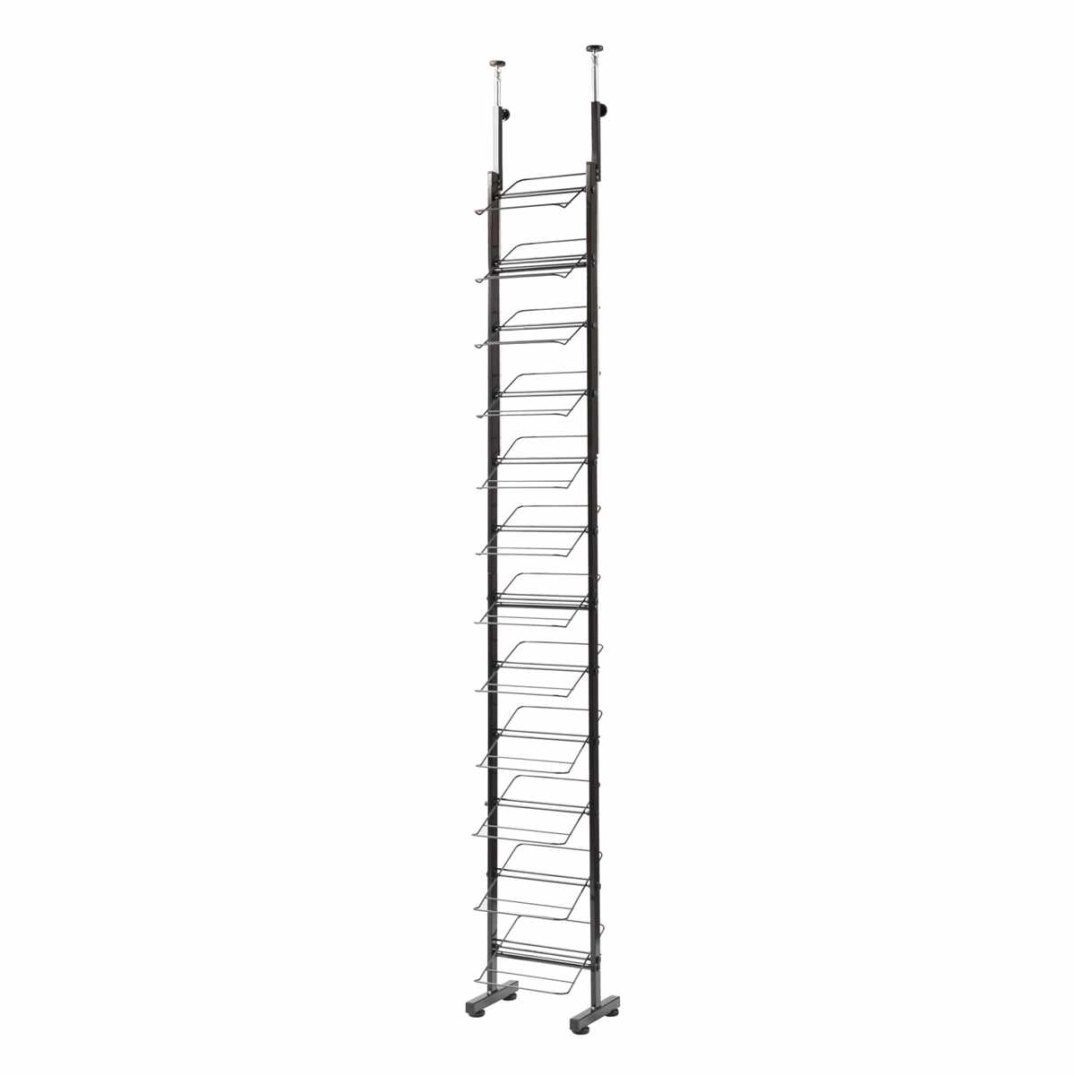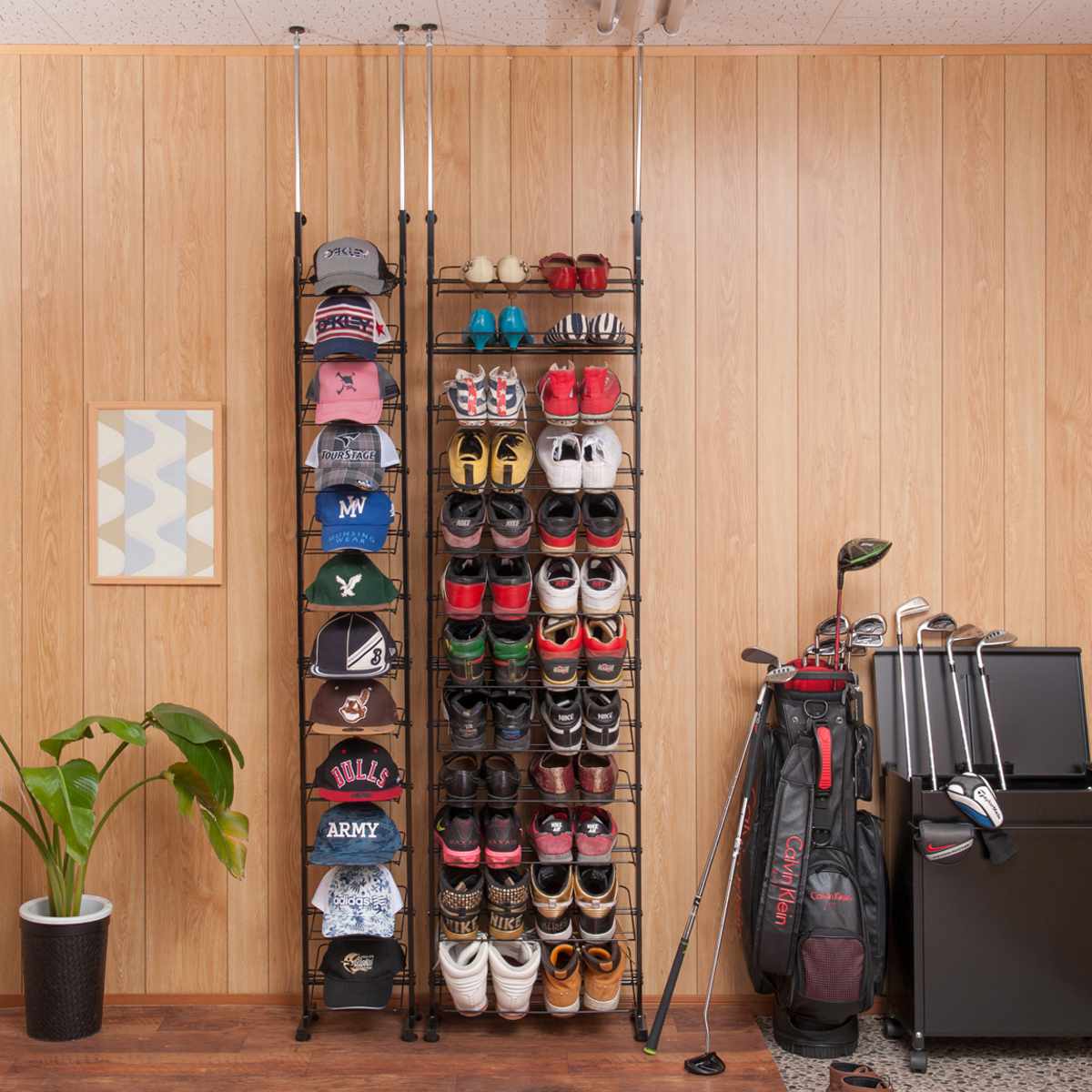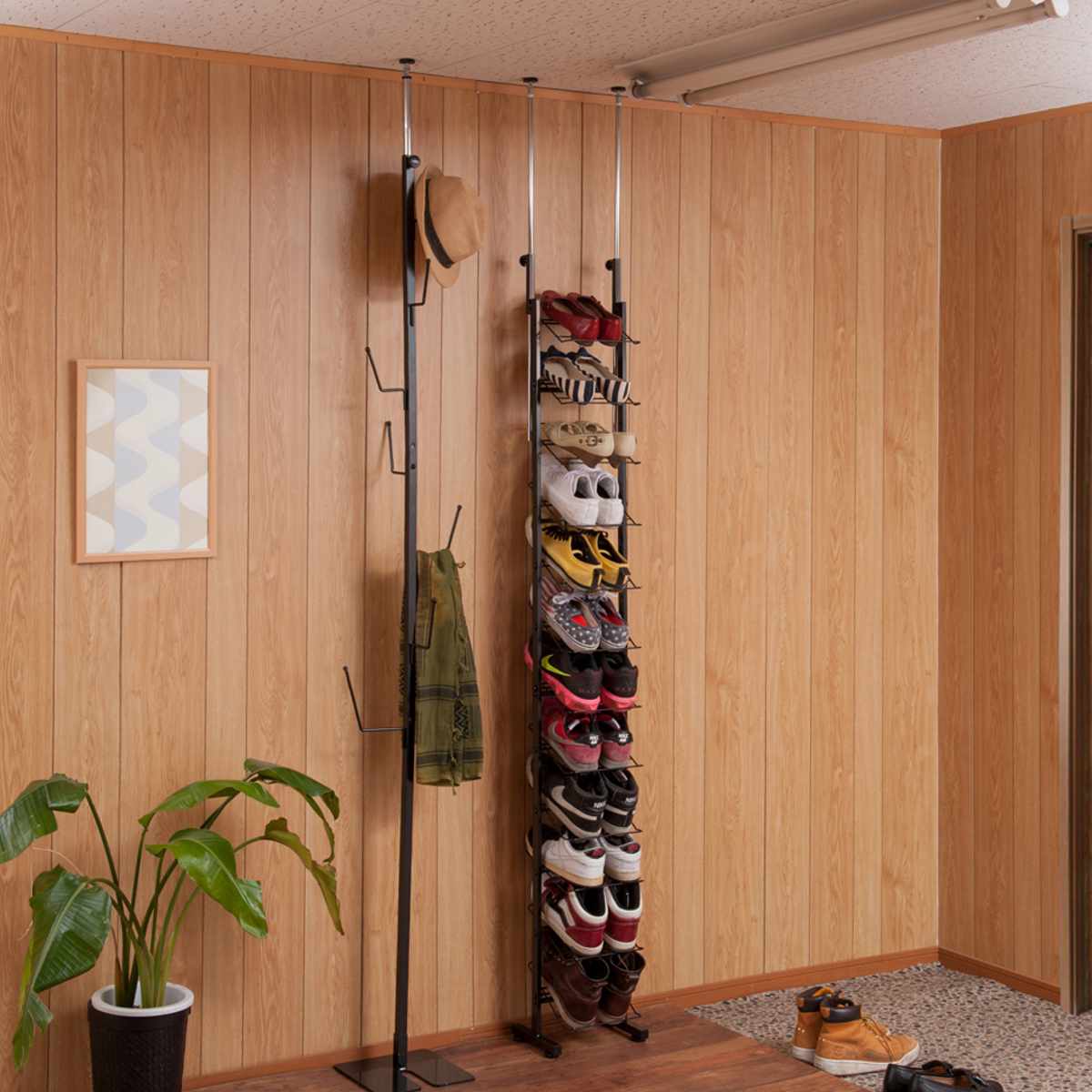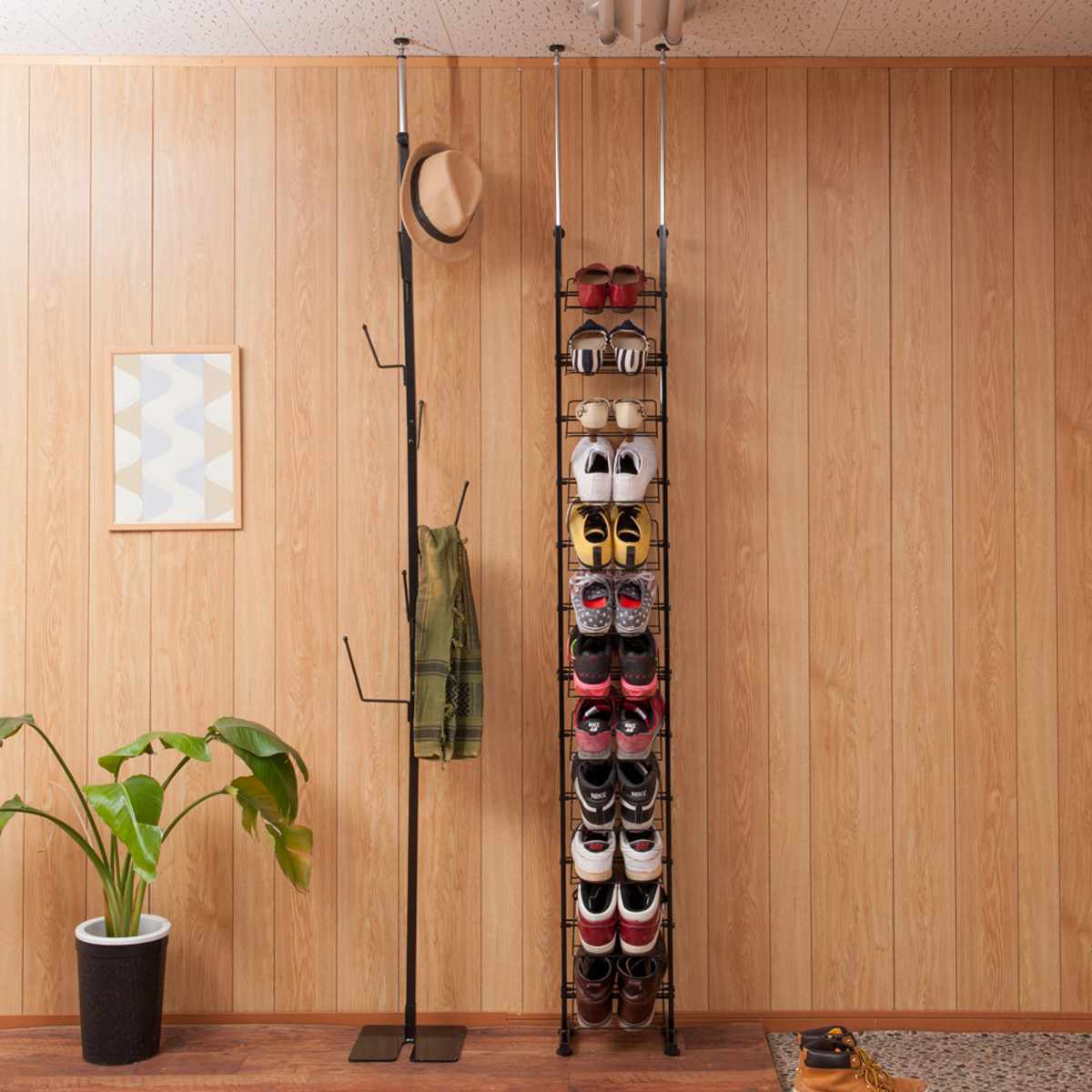 突っ張り シューズラック 幅29cm 薄型 ブラック 日本製 見せる収納 ( 壁面収納 つっぱり スリム 省スペース 靴収納 最大12足 つっぱり式 天井突っ張り式 靴 スニーカー ブーツ ヒール 収納 ラック シューズボックス 靴箱 下駄箱 )