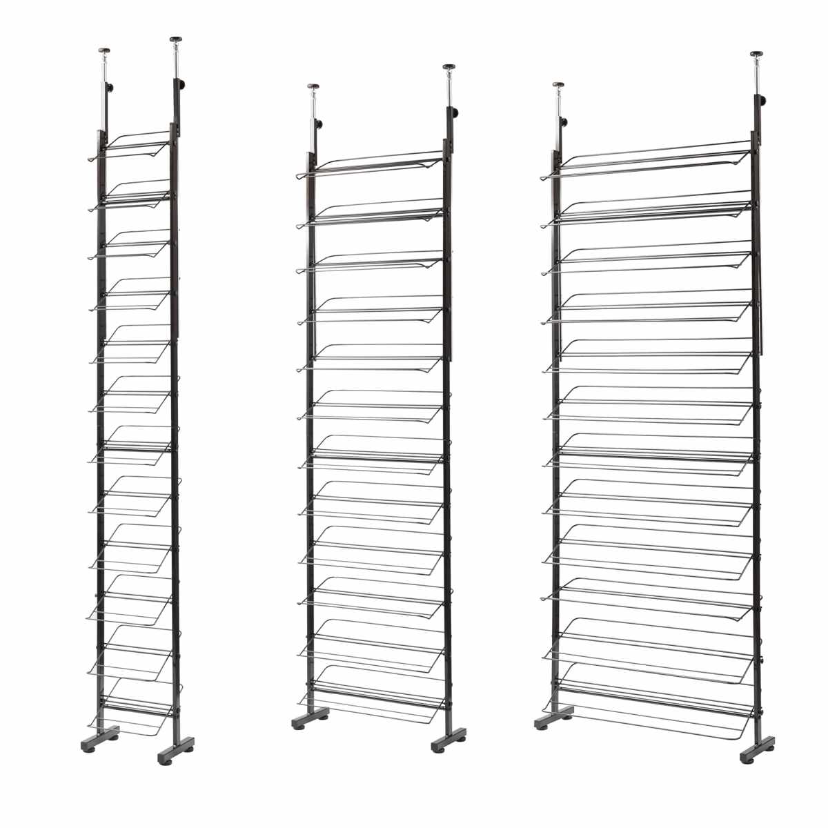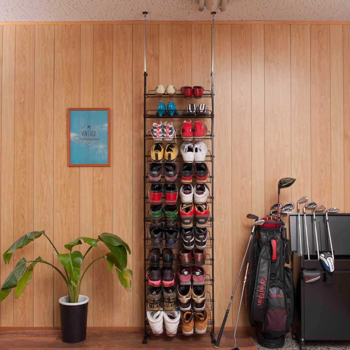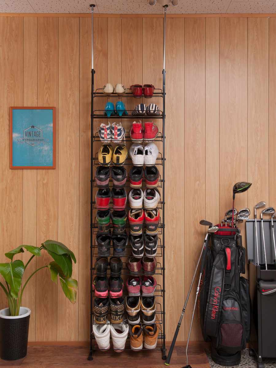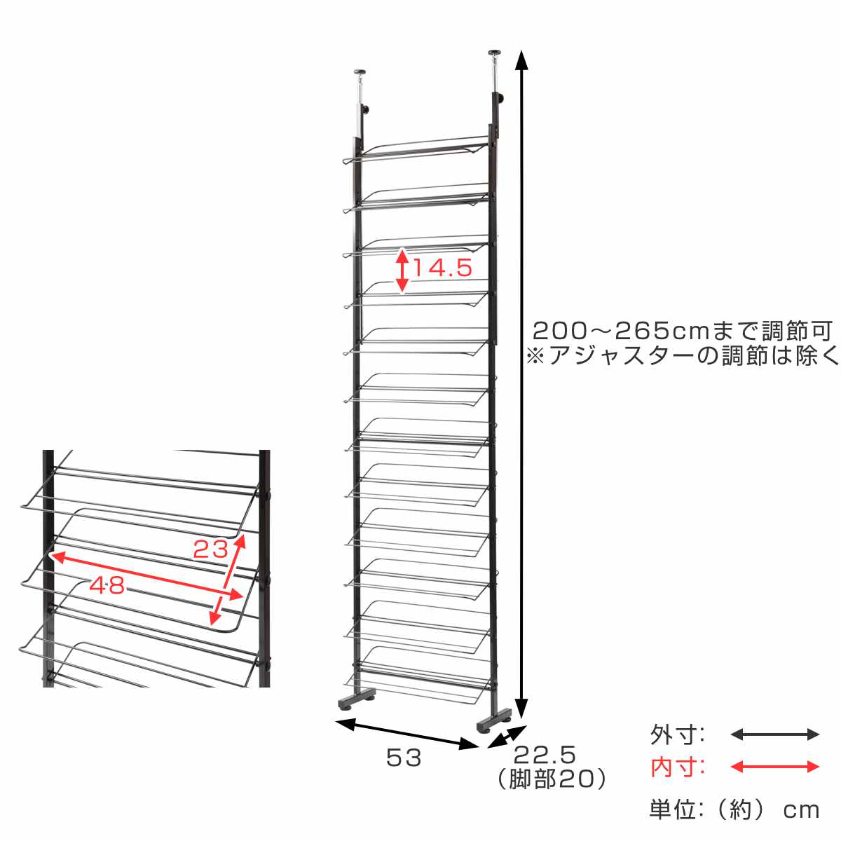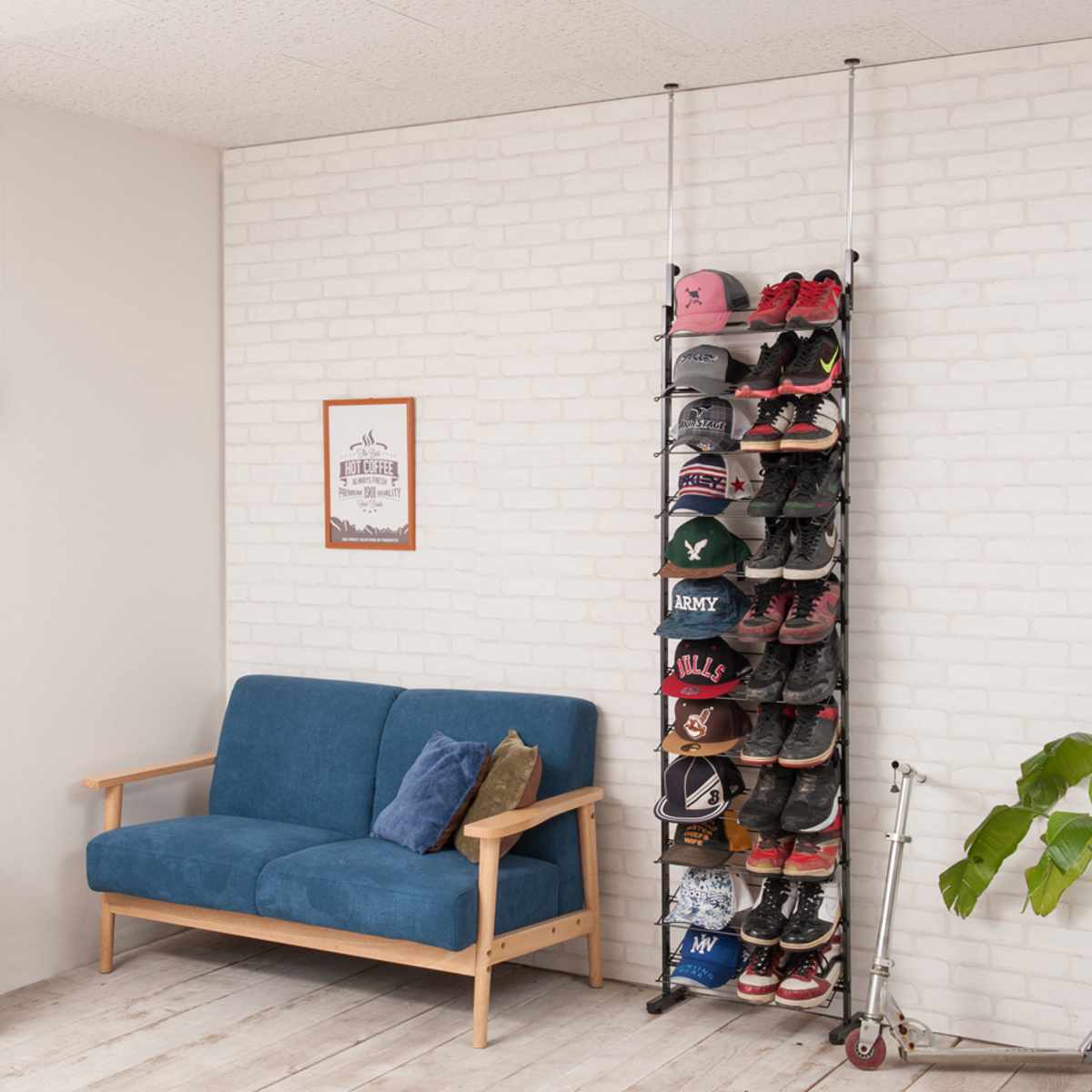 突っ張り シューズラック 幅53cm 薄型 ブラック 日本製 見せる収納 ( 壁面収納 つっぱり スリム 省スペース 靴収納 最大24足 つっぱり式 天井突っ張り式 靴 スニーカー ブーツ ヒール 収納 ラック シューズボックス 靴箱 下駄箱 )