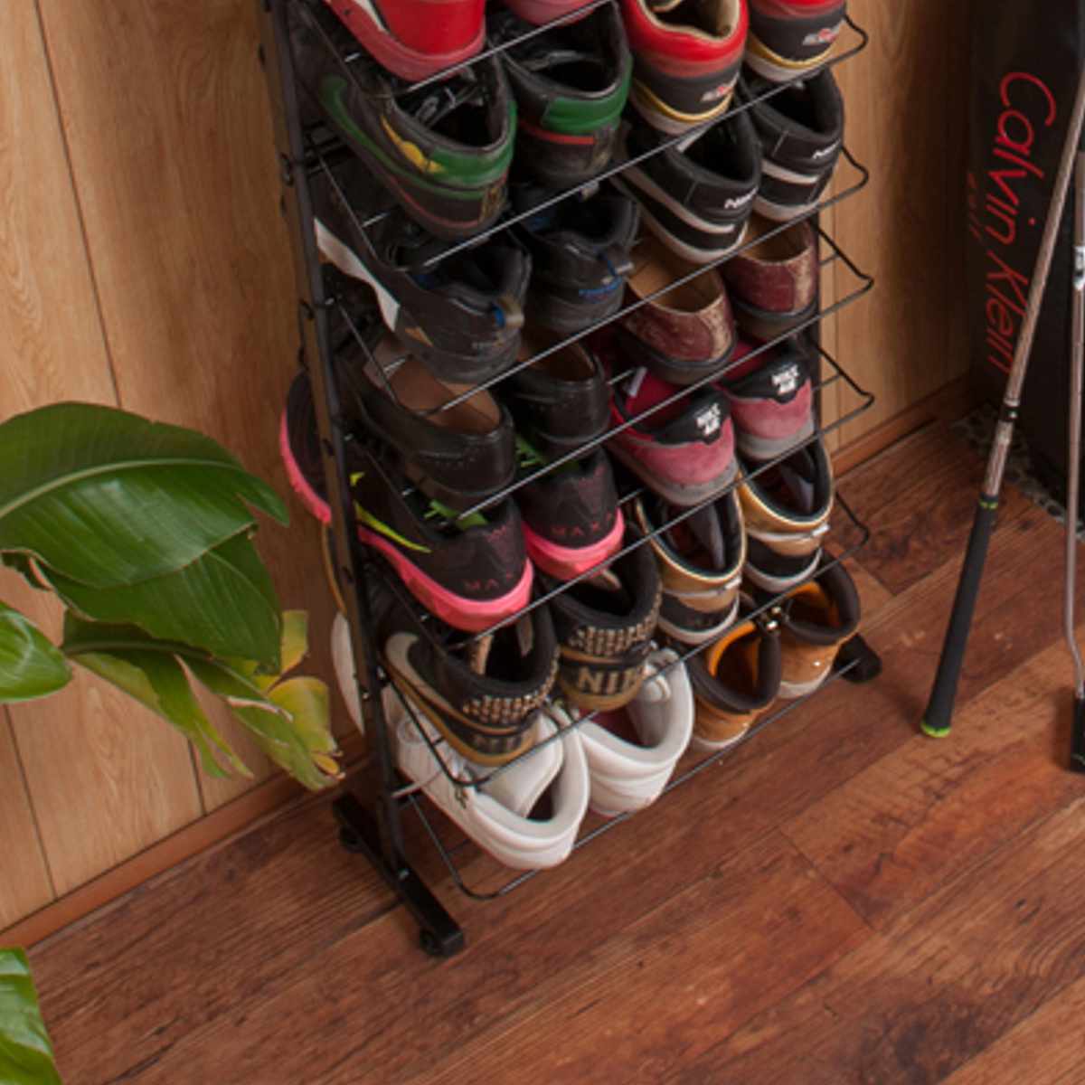 ぺったんこのシューズはもちろん、ワイヤー部分にヒール部分が引っかかるのでハイヒールでも収納できます。棚板を外せば背の高いブーツや長靴も収納可能です。