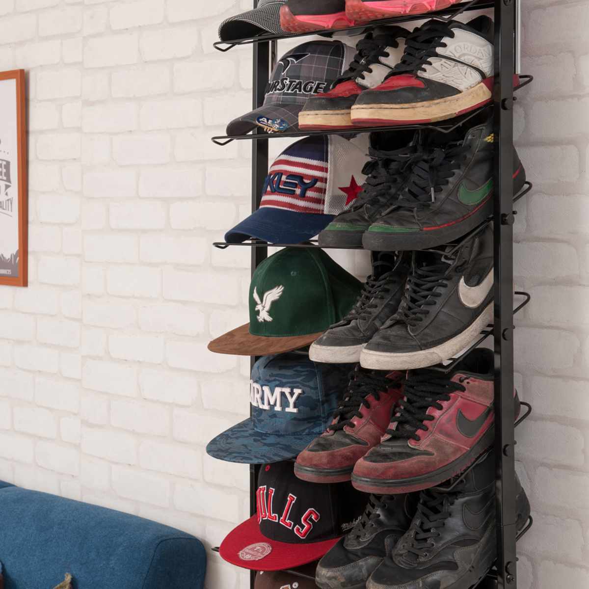 収納方法や使い方は自由自在です。靴を横向きに並べたり、帽子を置いたりと見せる収納として飾るのもおすすめです。玄関だけでなく、お部屋でもディスプレイ感覚で収納できます。黒のラックなので、カッコよくお洒落に引き立ててくれます。
