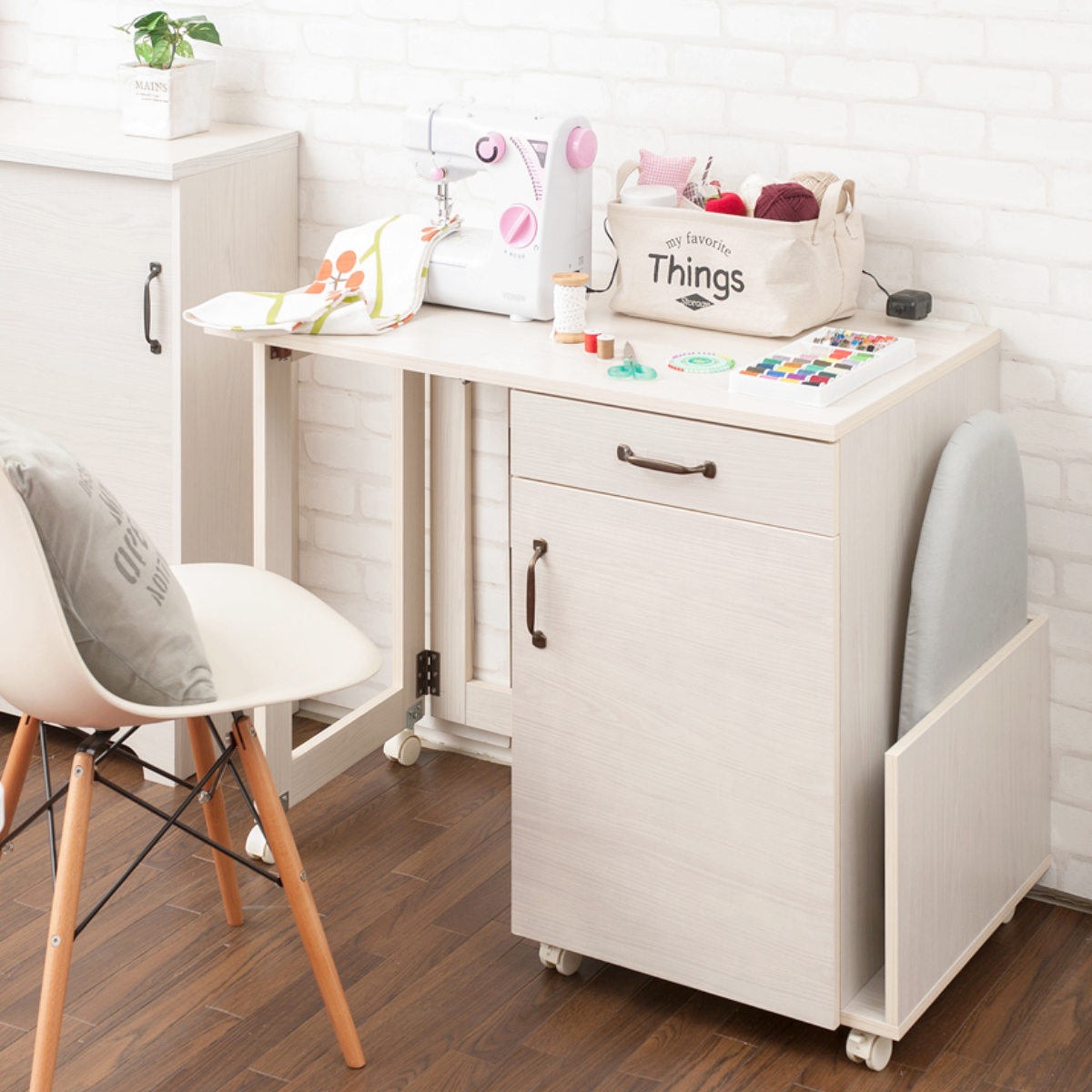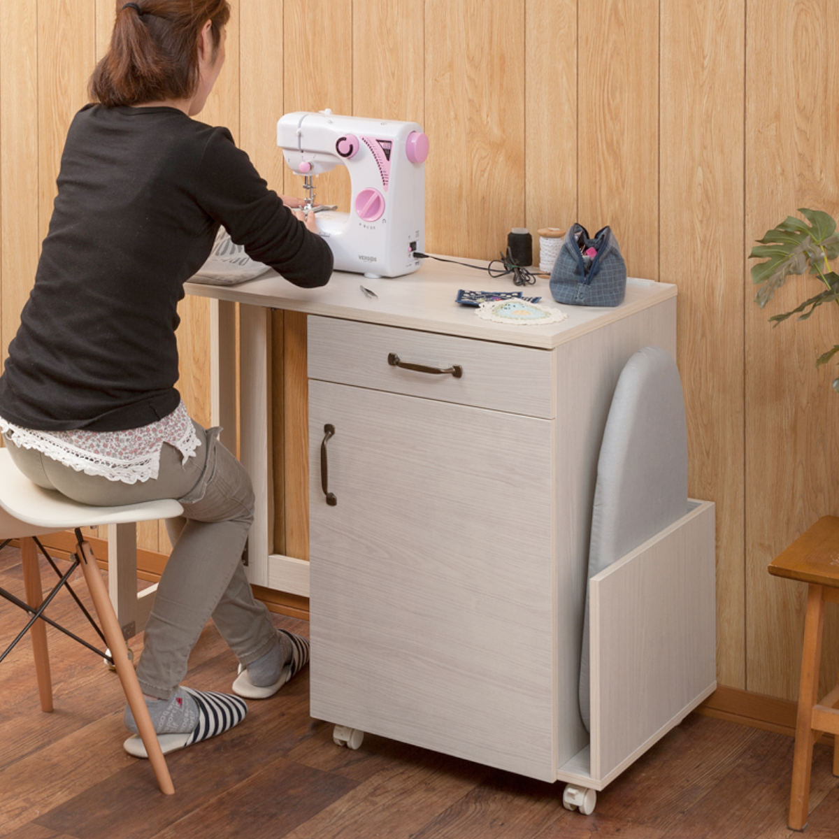 広げてワークスペース、折りたたんで収納。これ1台で家事がしやすくなるミシン台です。アイロン掛けやパソコン作業もでき、作業台を使わない時は収納棚としてお使いいただけます。