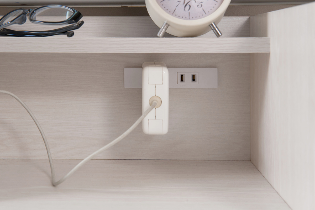 スマートフォンやタブレットなどを充電できる便利なコンセントが、天板下に2口付いています。