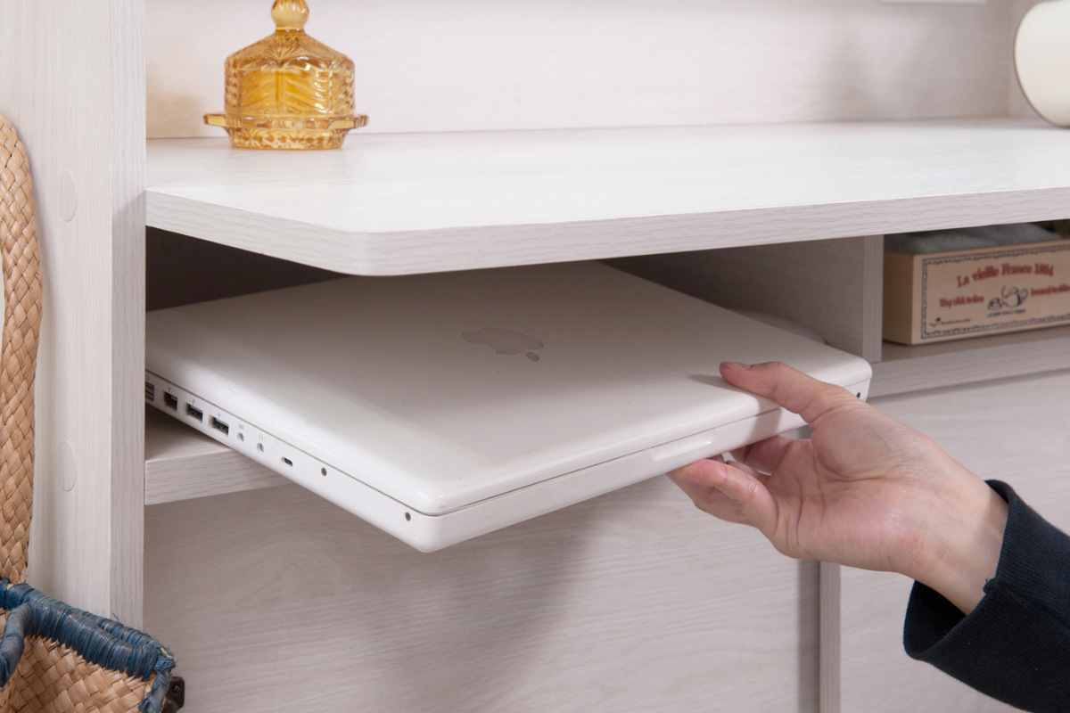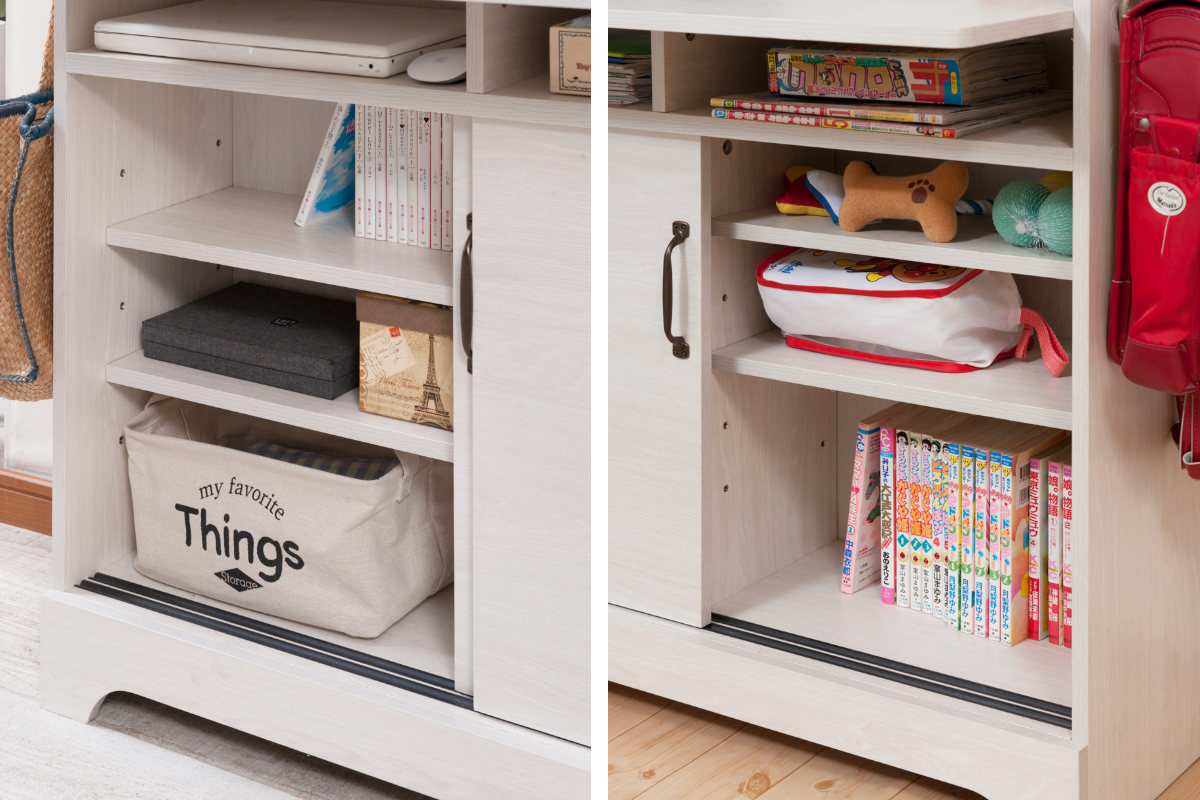 ノートパソコンや書類を収納するスペースがあり、スムーズに出し入れができます。また、引き戸式の扉は、座ったままでも扉の開閉ができ、中にはたっぷり収納ができます。