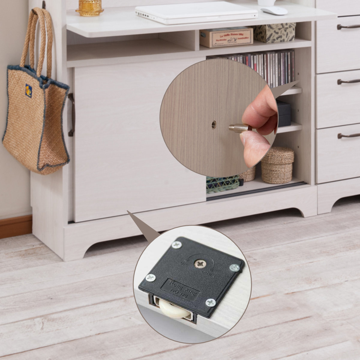 扉には滑車が付いているので、開閉がスムーズにできます。また、棚受けはネジ式の金具で棚板をしっかりキャッチして、金具外れがありません。