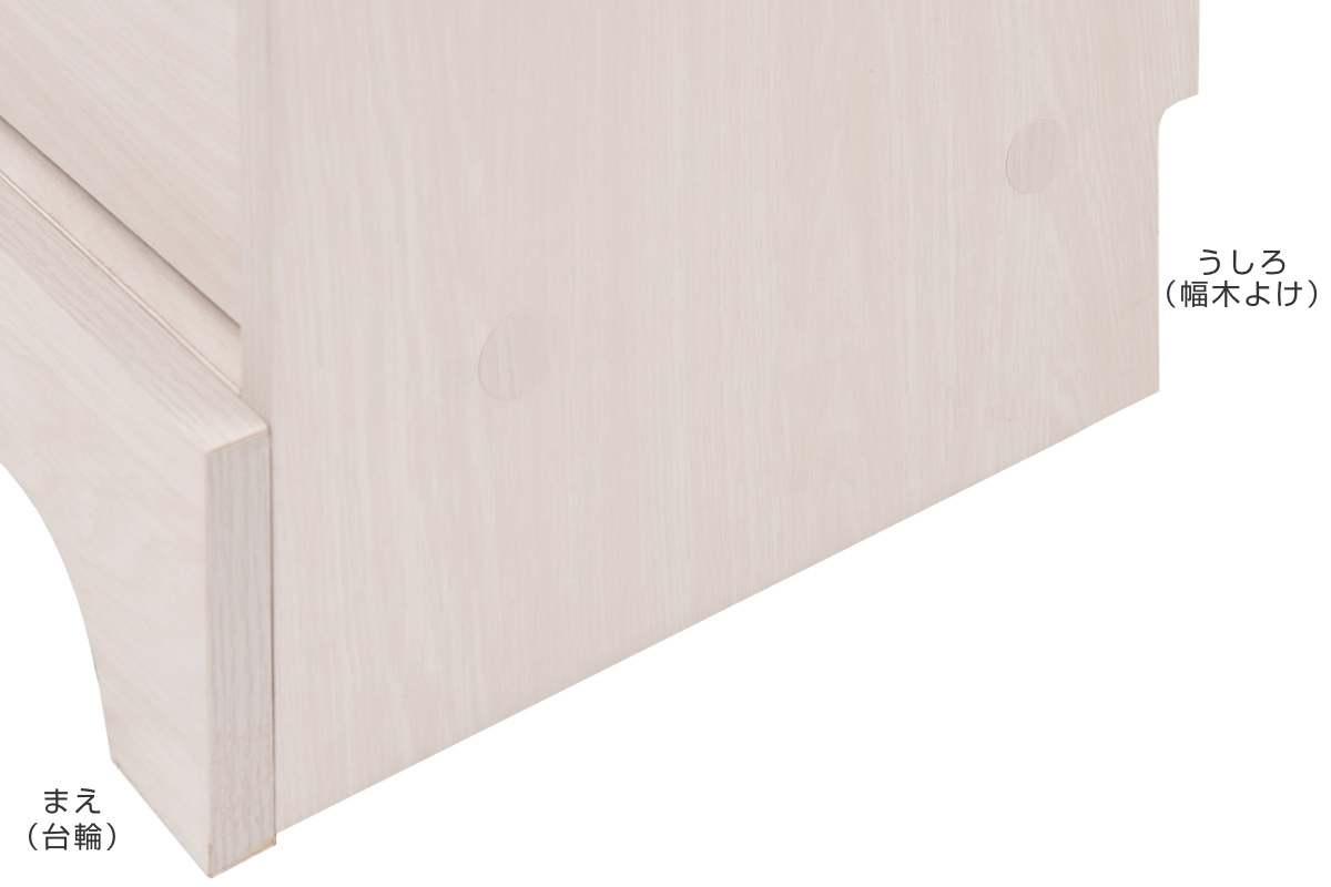 台輪部はアーチ状にくり抜かれています。直線的な本体にアールを付けた台輪は、シンプルでありながら存在を感じられます。また、背面下にL型の切り込みがあるため、幅木をよけて壁にぴったりと設置することができます。