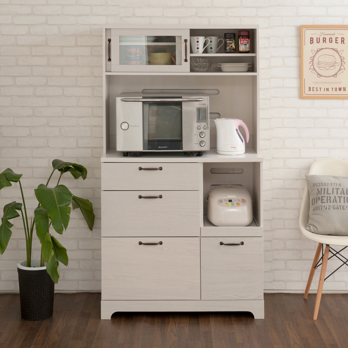 「Late」シリーズのキッチンボード(幅90cm)です。引き戸部・オープン部・引出し部で収納ができ、家電や食器などをまとめて収納できます。ひとり暮らしなどのスペースが少ないお部屋や、天井が低いスペースにも圧迫感なく置けます。