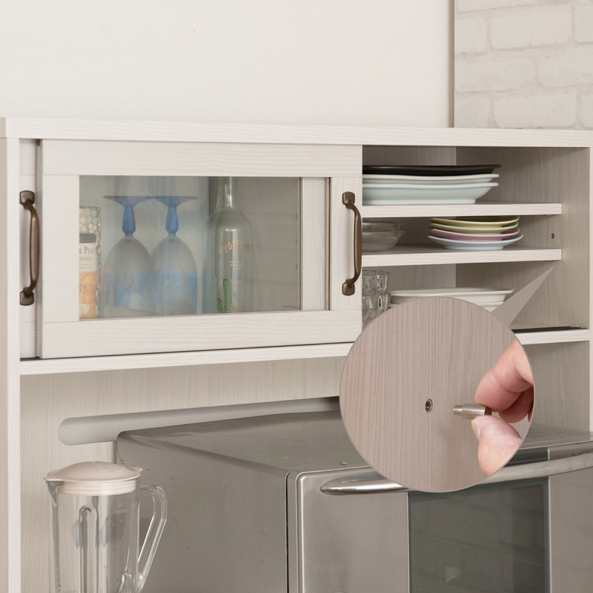 | 材質 | 本体:強化プリント紙化粧繊維板 カウンター天板・スライド棚:ソフトメラミン化粧繊維板 扉枠内:強化ガラス |