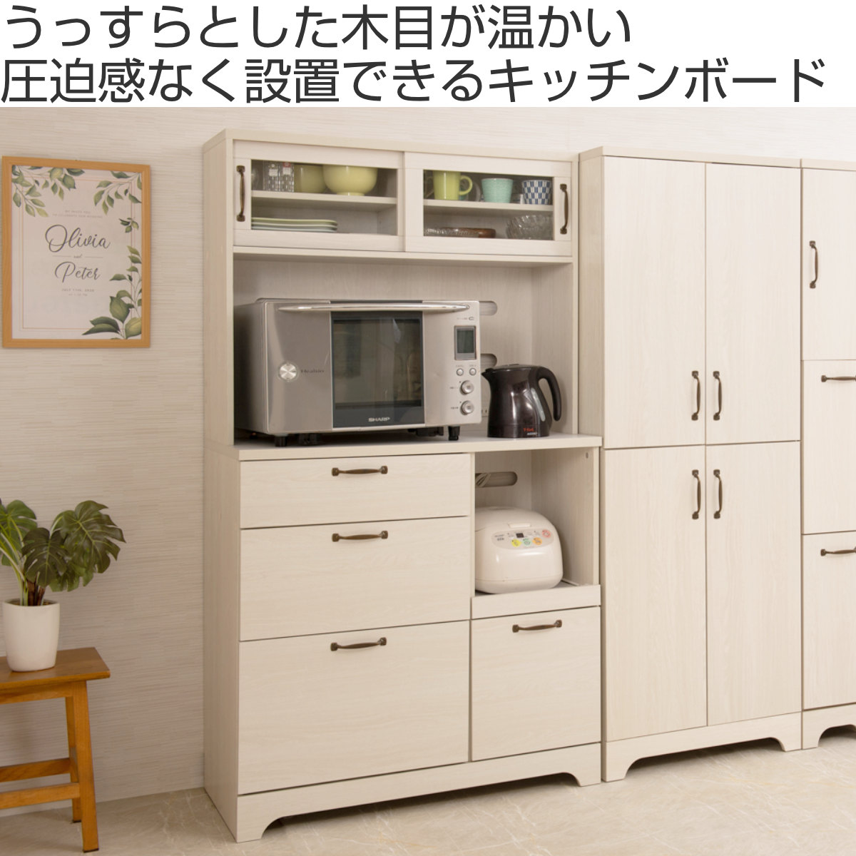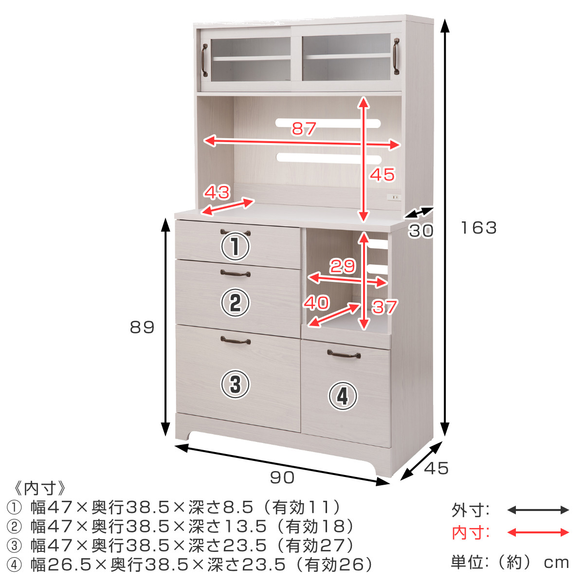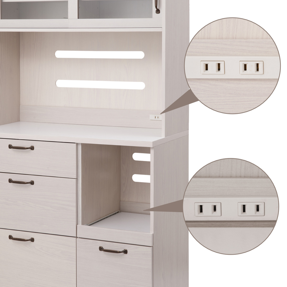 キッチンボード 幅90cm 2口コンセント×2ヶ ホワイト木目 ( Late ラテ レンジ台 収納 可動棚 コンセント付 家電 食器棚 ラック 棚 キッチン ホワイト 白 引出し スライドレール )
