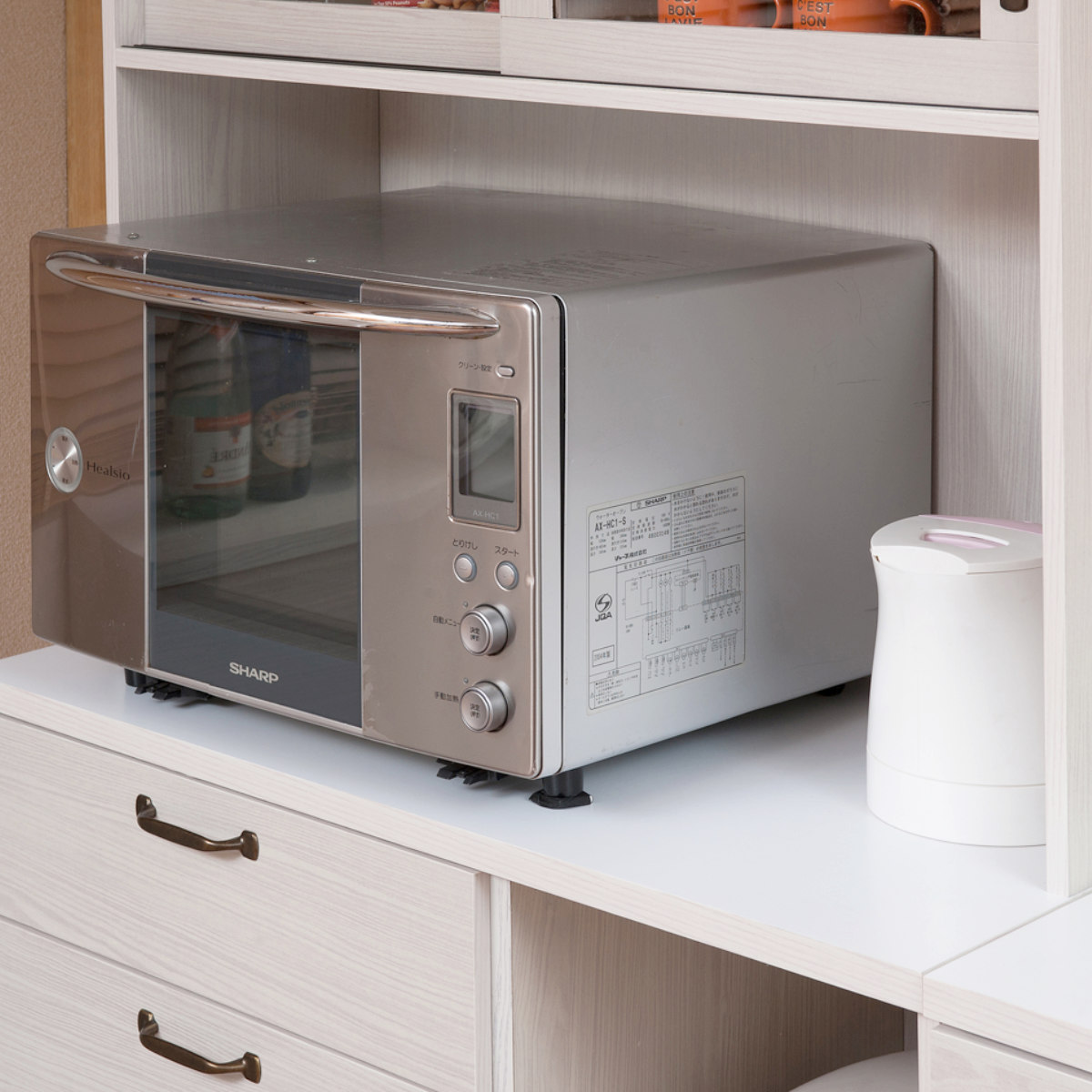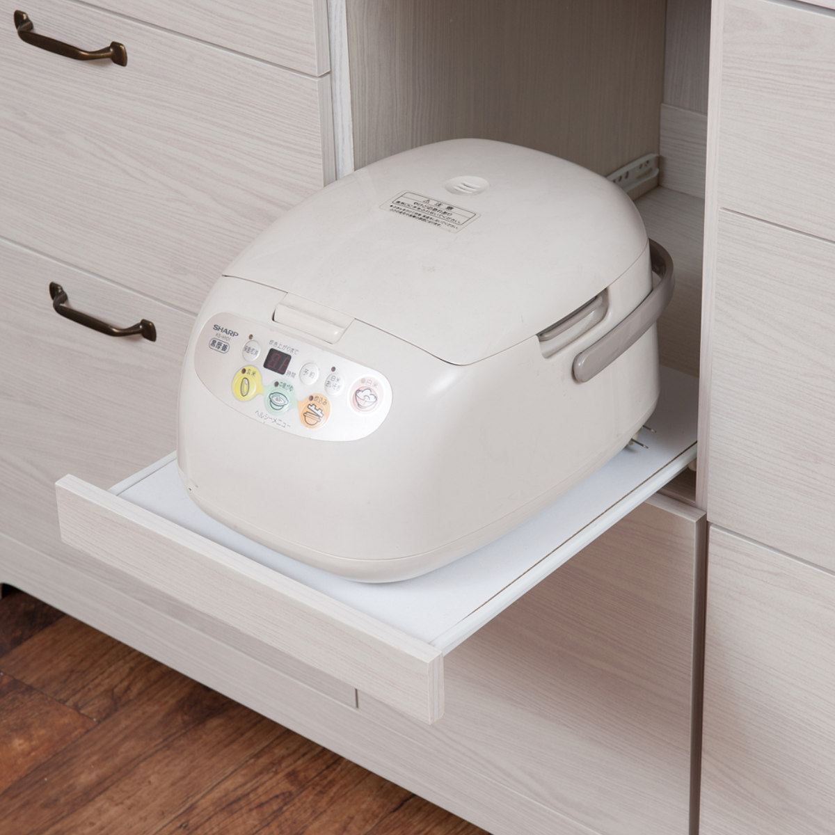 家電製品を置く面には、傷・水に強いソフトメラミン素材を採用しています。下段はスライド棚で、炊飯器やポットなどの蒸気が出るものを使う際は、前に出して使うことができます。