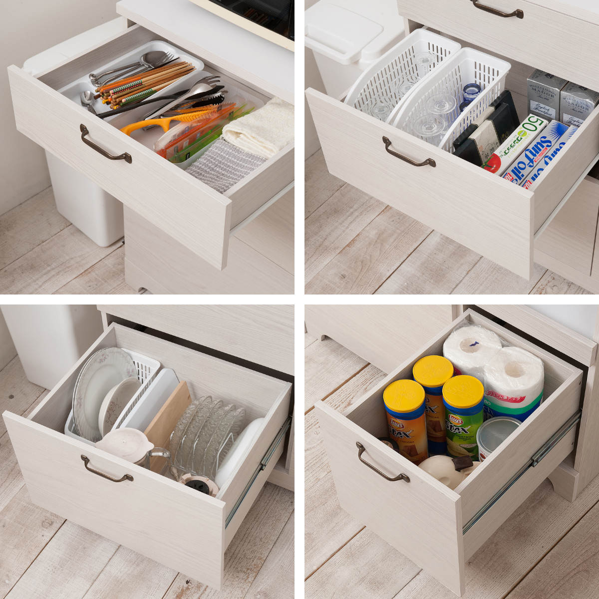 引出しが4杯あり、下段はフルスライドレールで、手前までしっかり引き出すことができます。食器やカトラリー、調理器具やストック品など、キッチン周りの様々なものを収納できます。引出しの中を上から見渡せるので、整理がしやすく、探しやすいです。