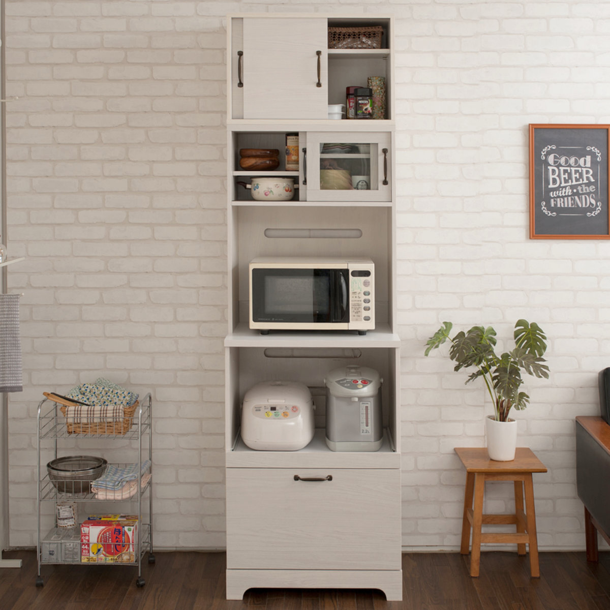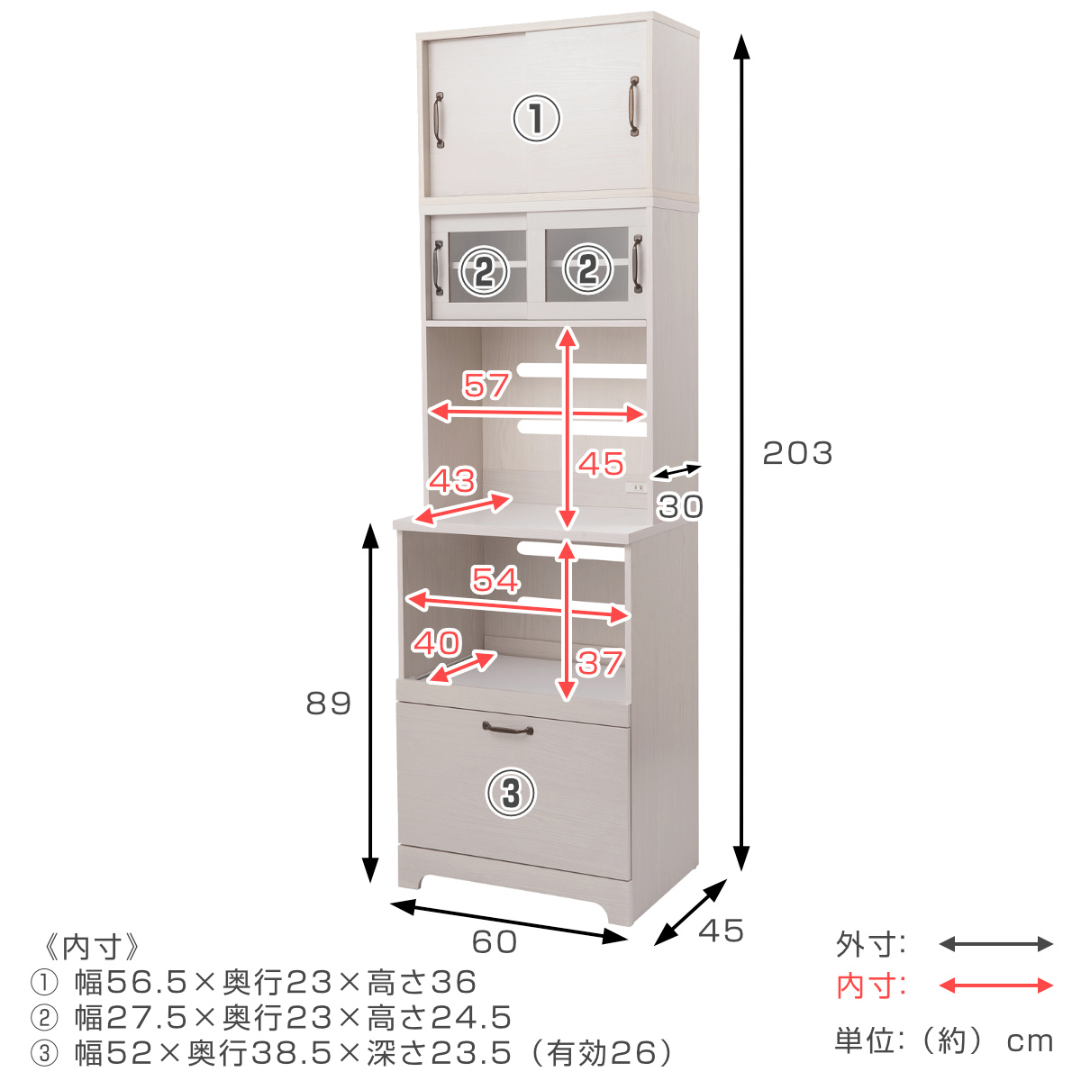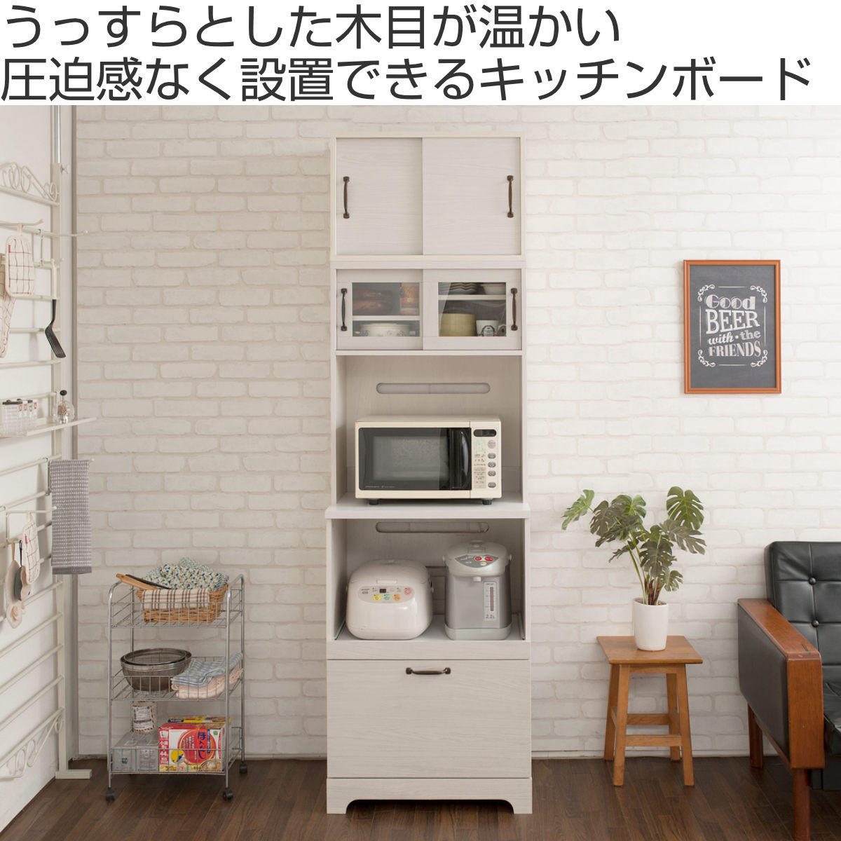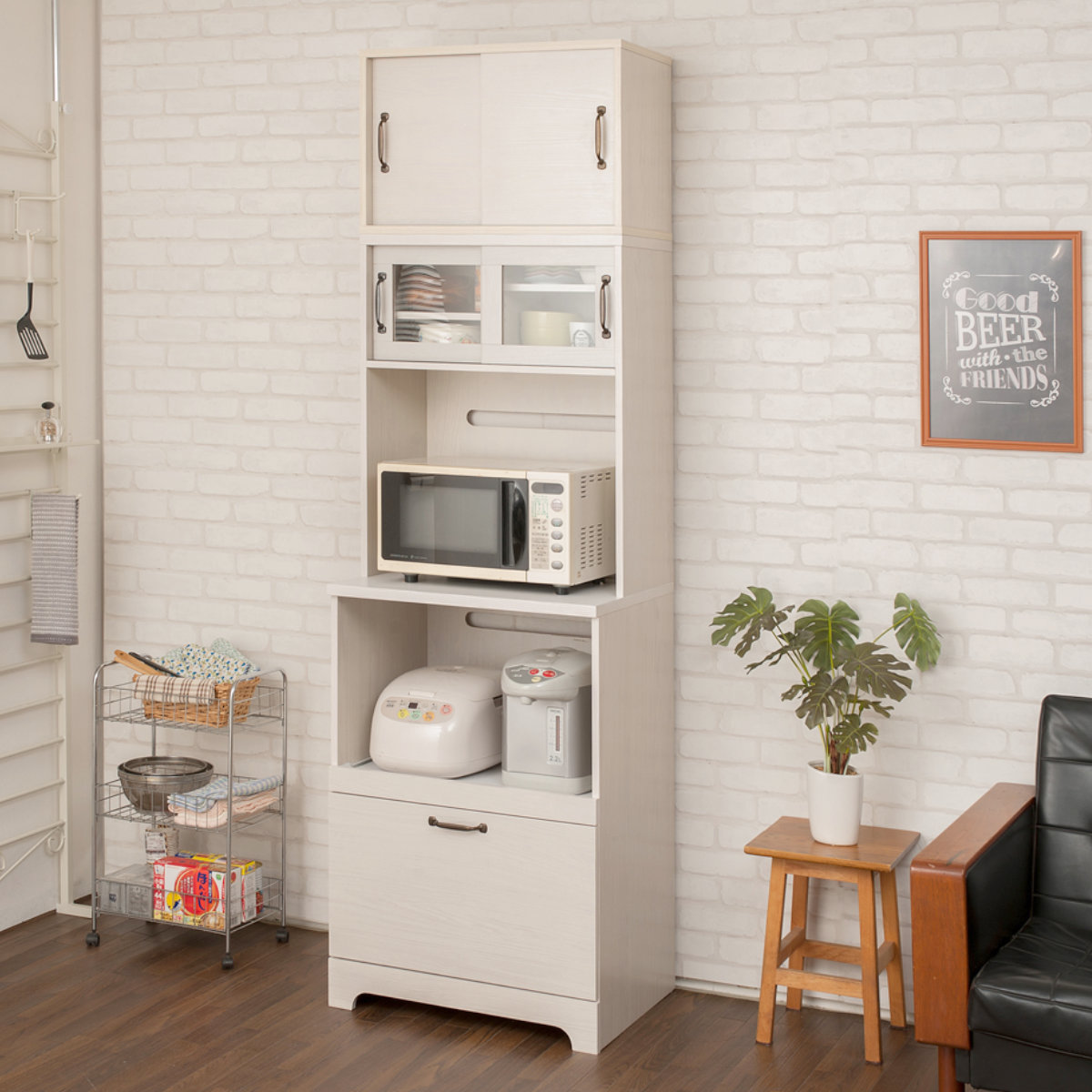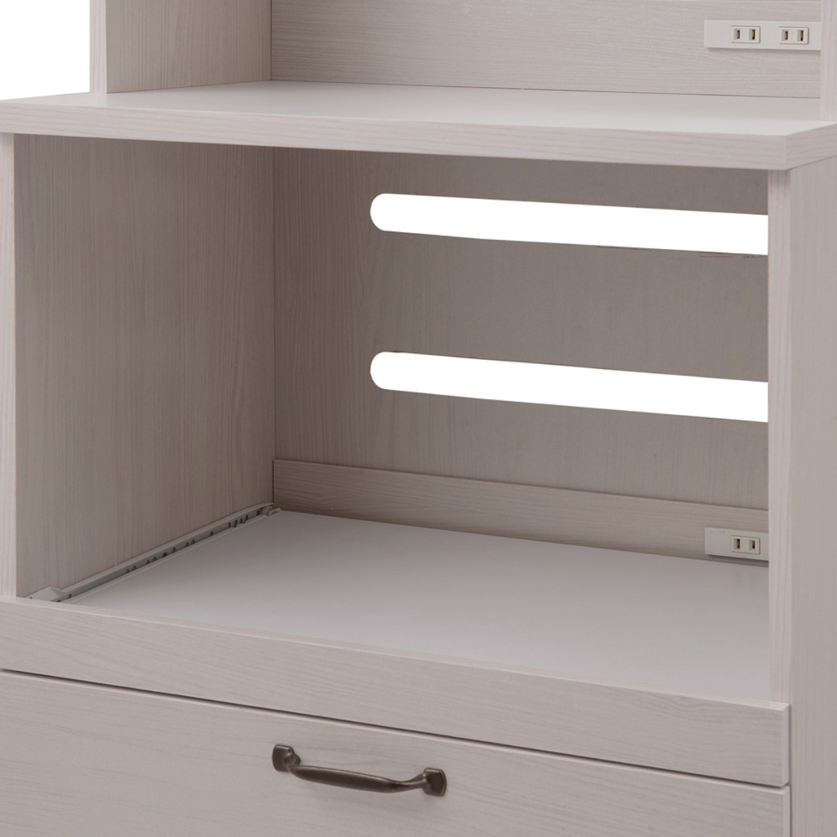 ハイタイプ キッチンボード 幅60cm 2口コンセント×2ヶ ホワイト木目 ( Late ラテ レンジ台 収納 可動棚 コンセント付 上置き棚付 家電 食器棚 ラック 棚 キッチン ホワイト 白 引出し スライドレール )