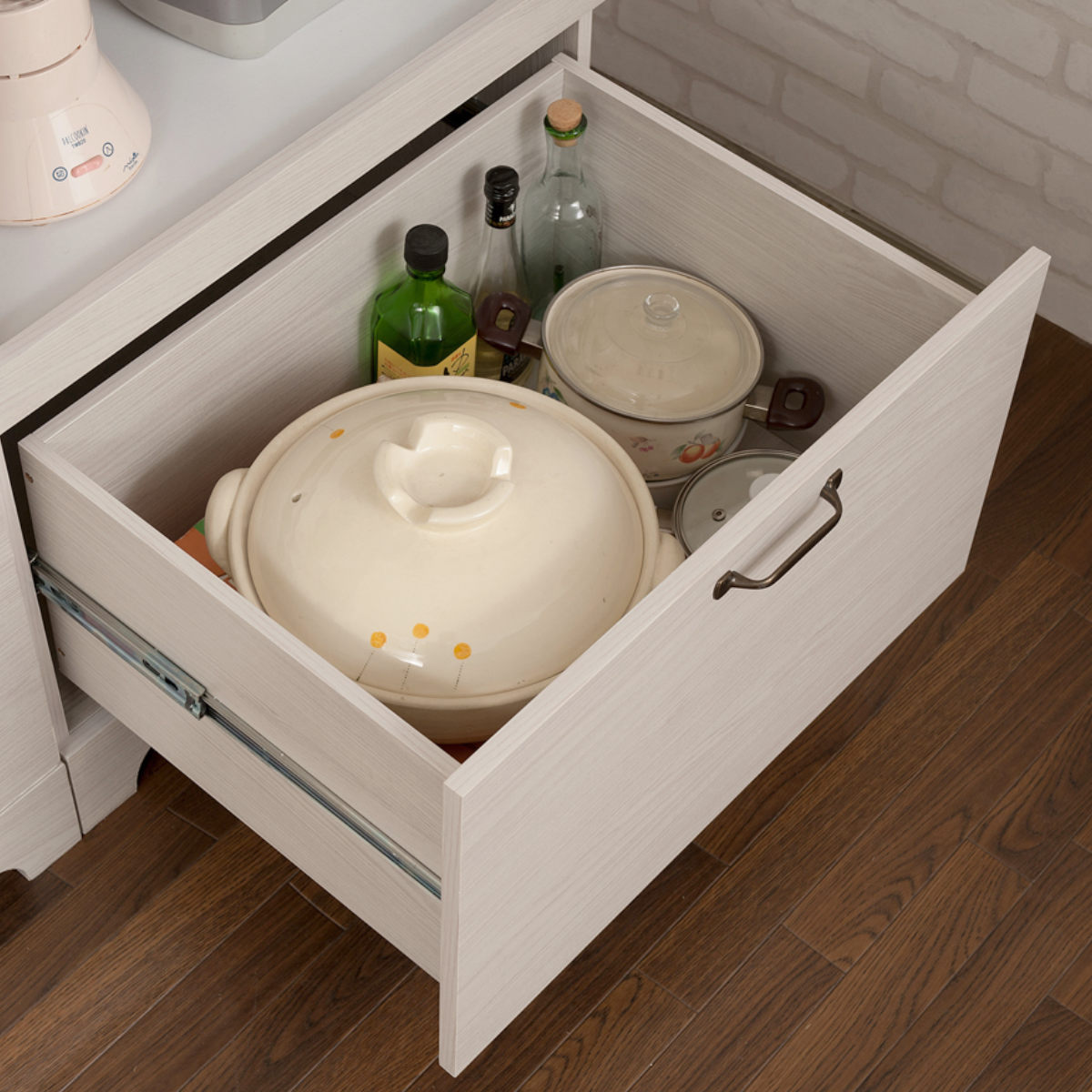 引出しは、フルスライドレールで、手前までしっかり引き出すことができます。深型なので、食器や調理器具、ストック品など、キッチン周りの様々なものを収納できます。引出しの中を上から見渡せるので、整理がしやすく、探しやすいです。