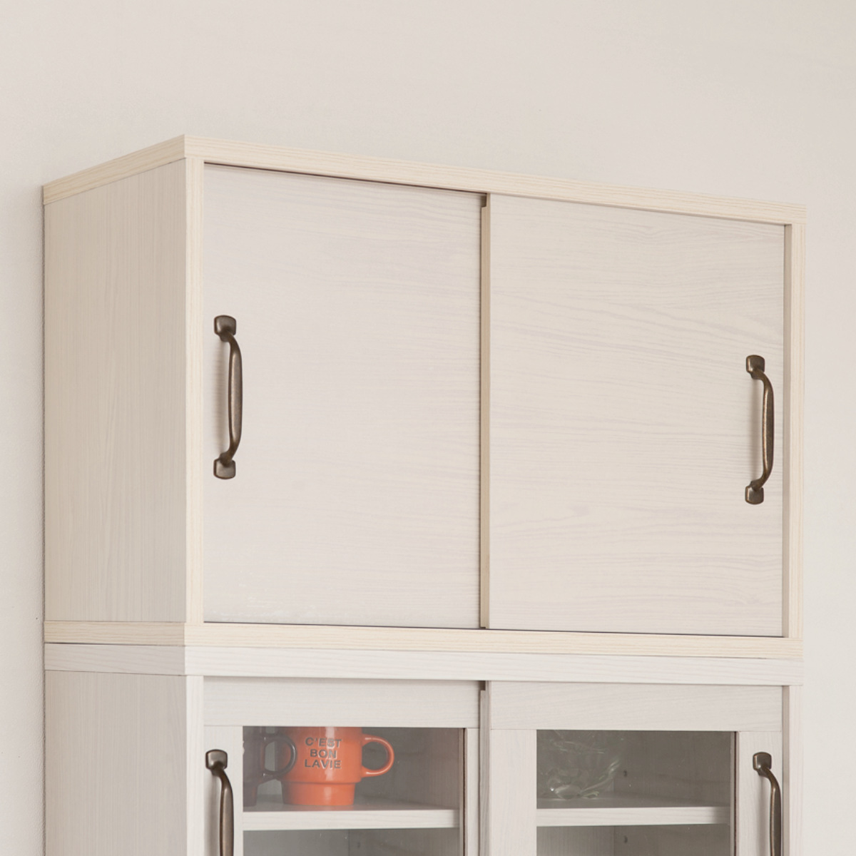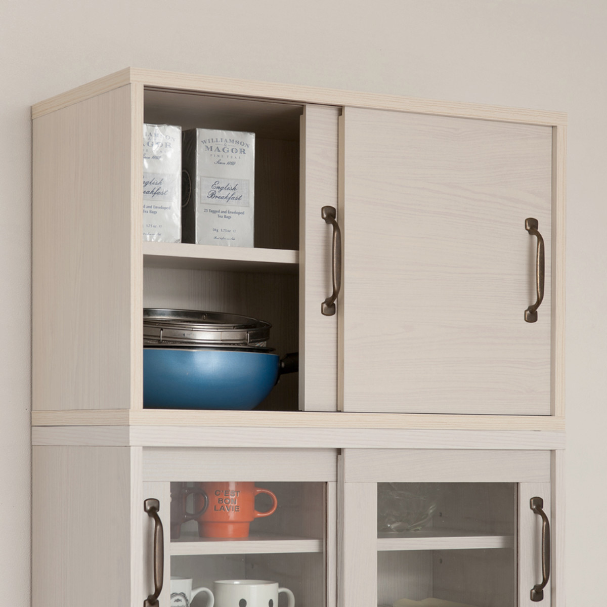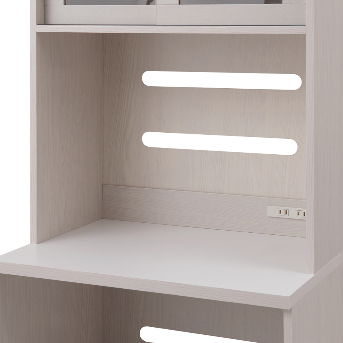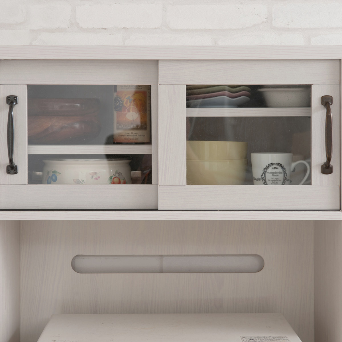 | 材質 | 本体:強化プリント紙化粧繊維板 カウンター天板・スライド棚:ソフトメラミン化粧繊維板 扉枠内:強化ガラス |