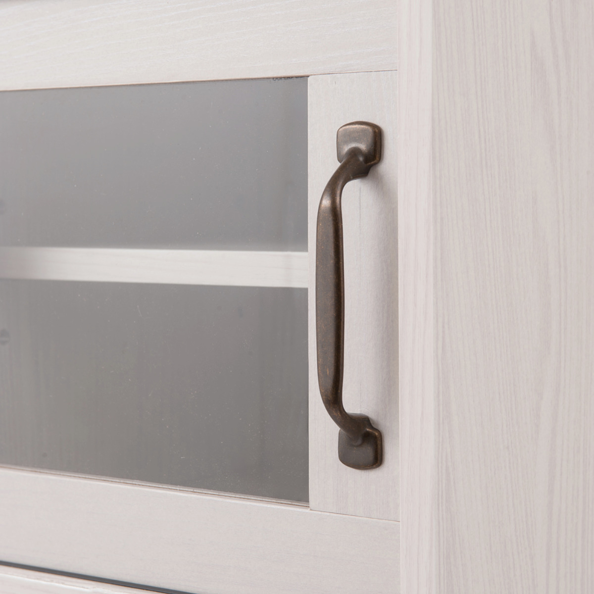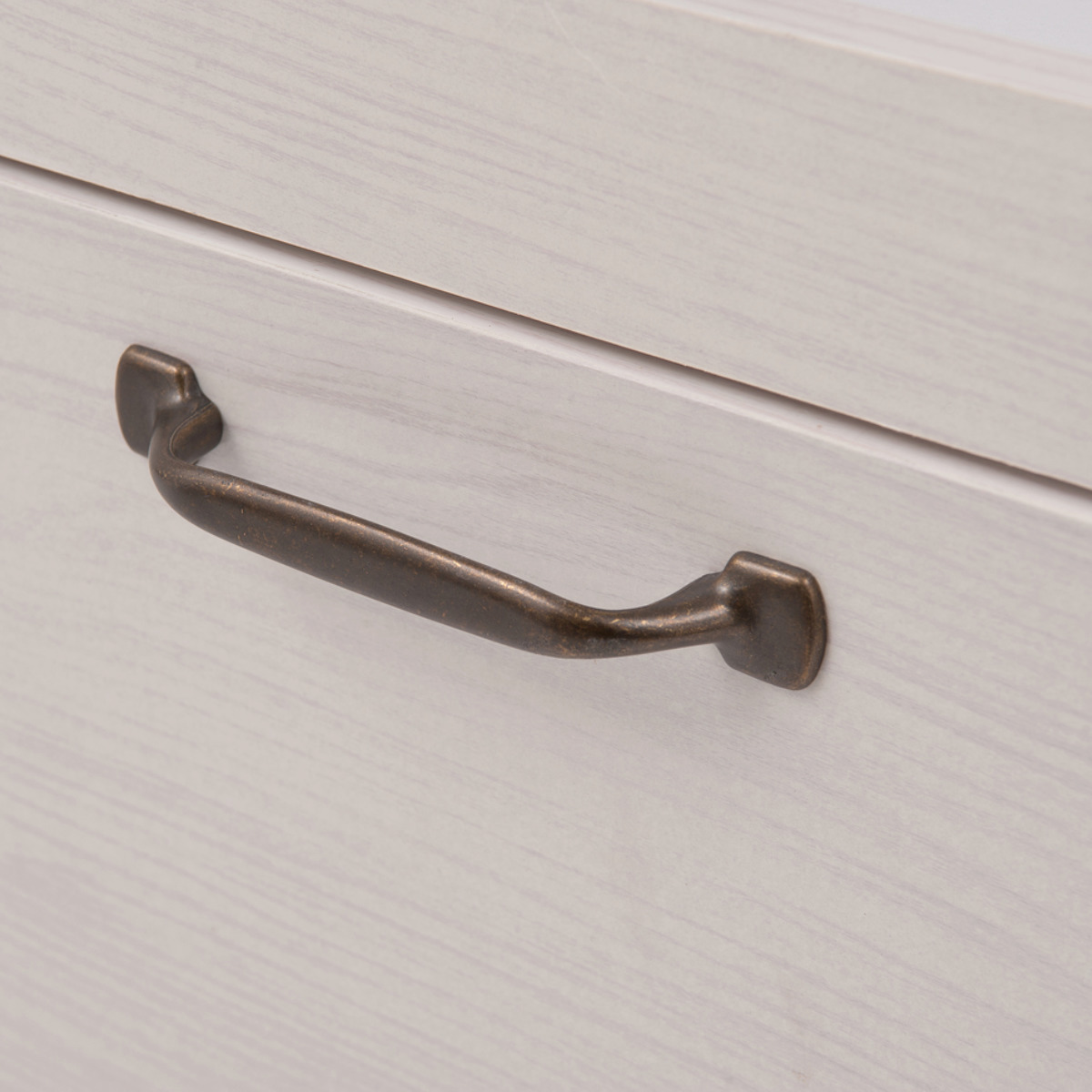 重厚感のある取っ手は持ちやすく、開け閉めもしやすいです。鉄製にゴールドをいぶしたような焼付け塗装で仕上げ、木目にぴったりと合う落ち着いたデザインです。