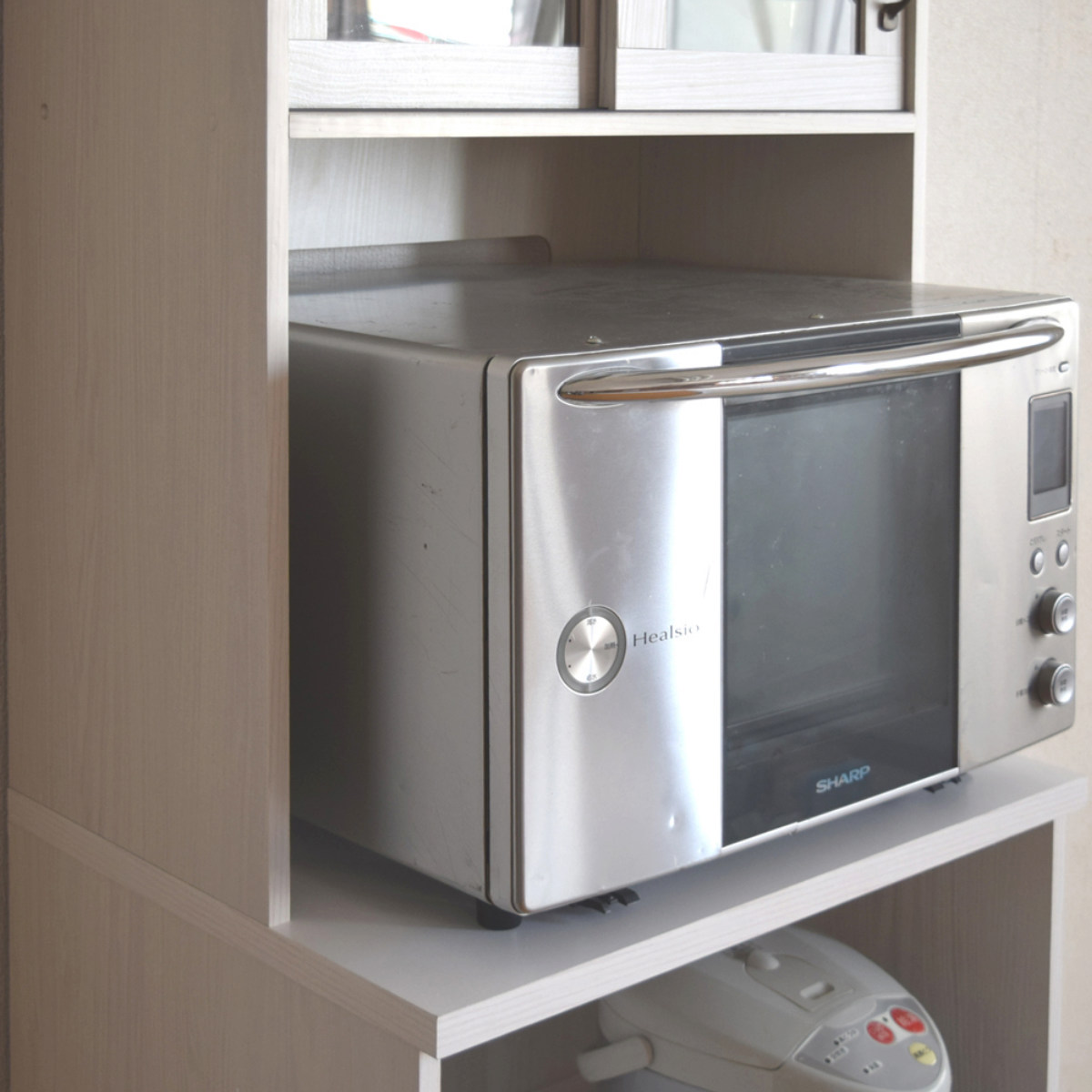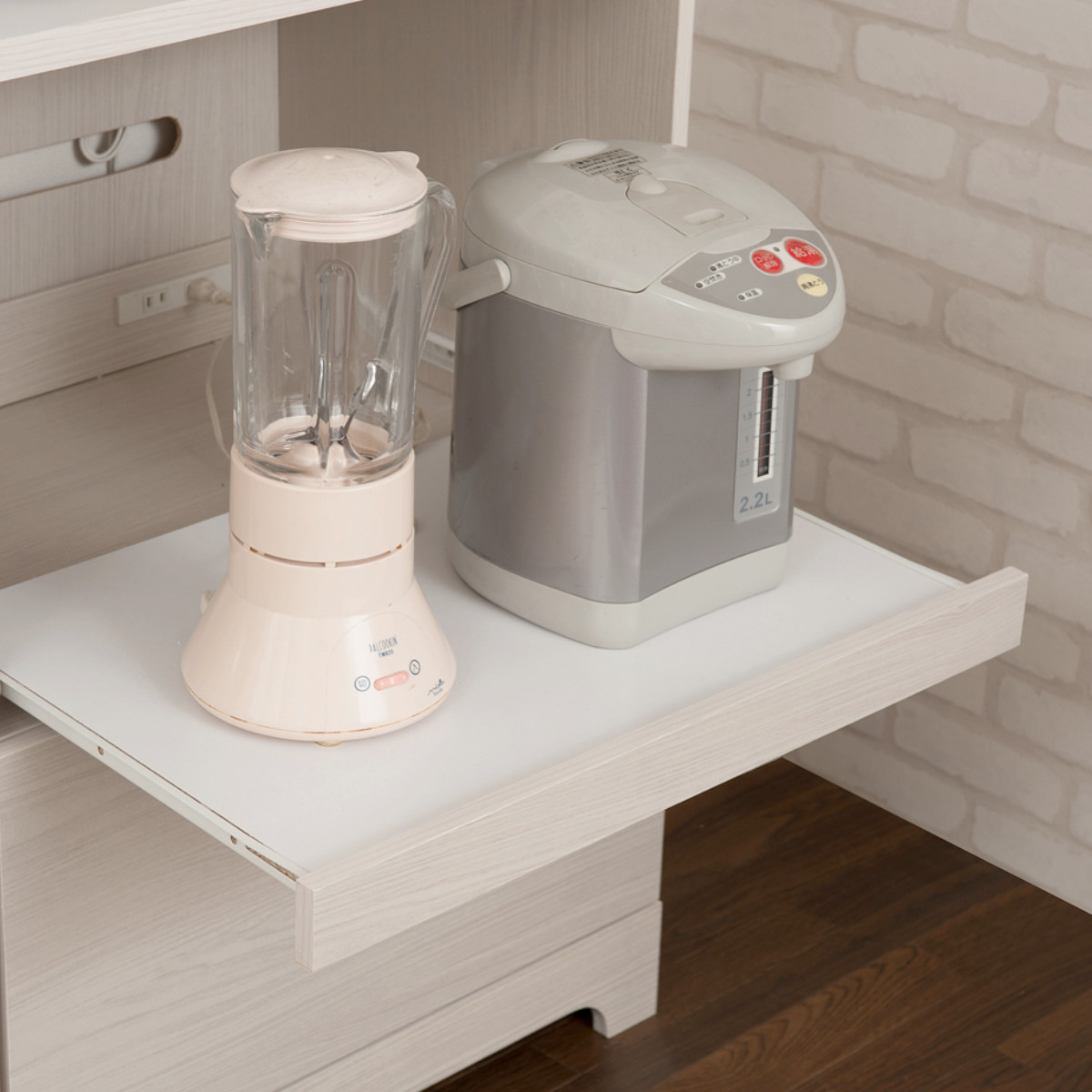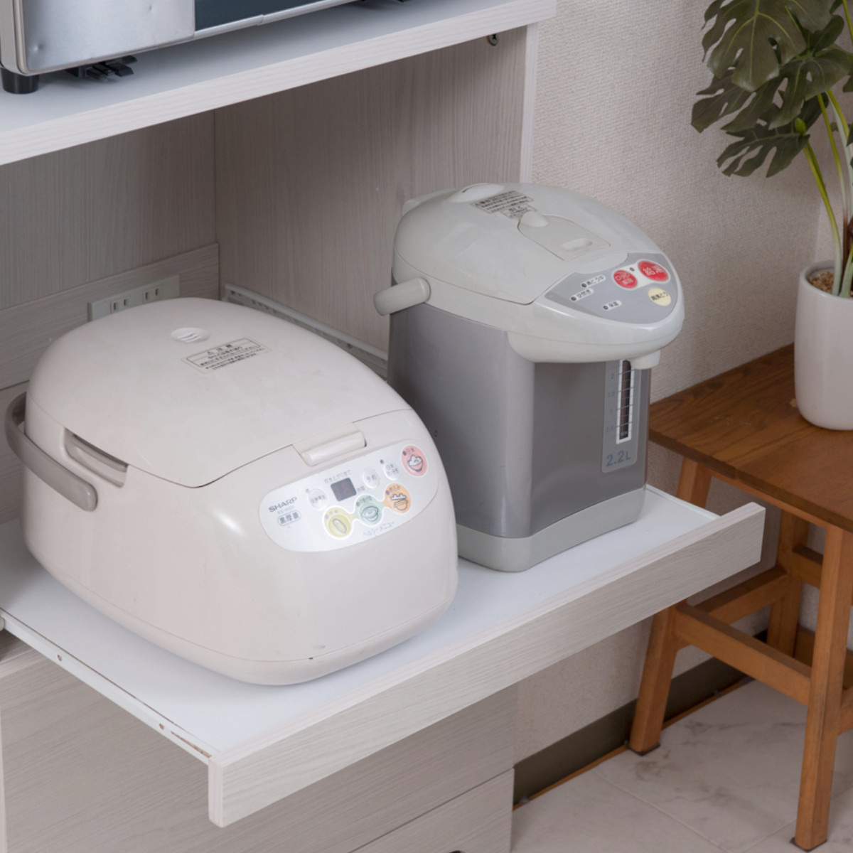 家電製品を置く面には、傷・水に強いソフトメラミン素材を採用しています。下段はスライド棚で、炊飯器やポットなどの蒸気が出るものを使う際は、前に出して使うことができます。