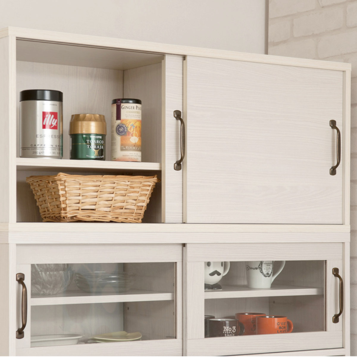 | 材質 | 本体:強化プリント紙化粧繊維板 カウンター天板・スライド棚:ソフトメラミン化粧繊維板 扉枠内:強化ガラス |