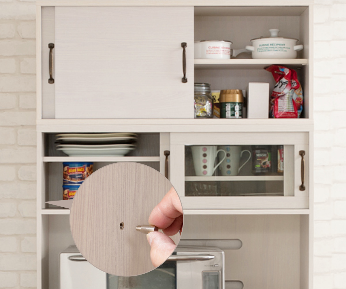 引き戸扉は前のスペースが無くても開閉ができるので使いやすいです。可動棚が付属しているので、収納物に合わせて高さを調整していただけます。ネジ式の金具で棚板をしっかりキャッチして、金具外れがありません。
