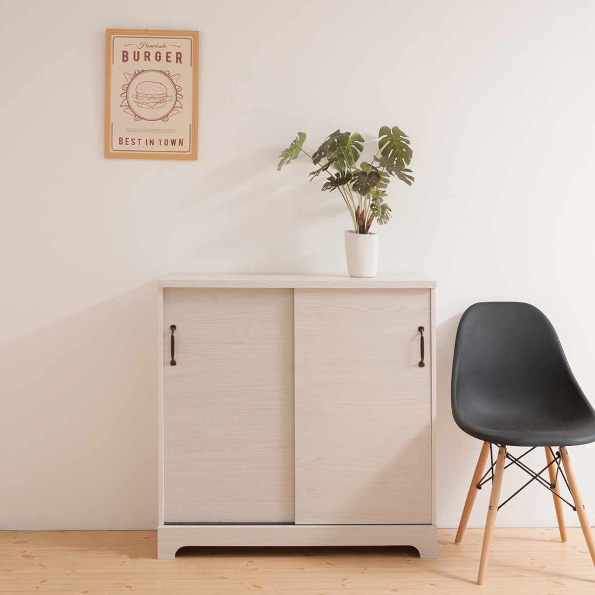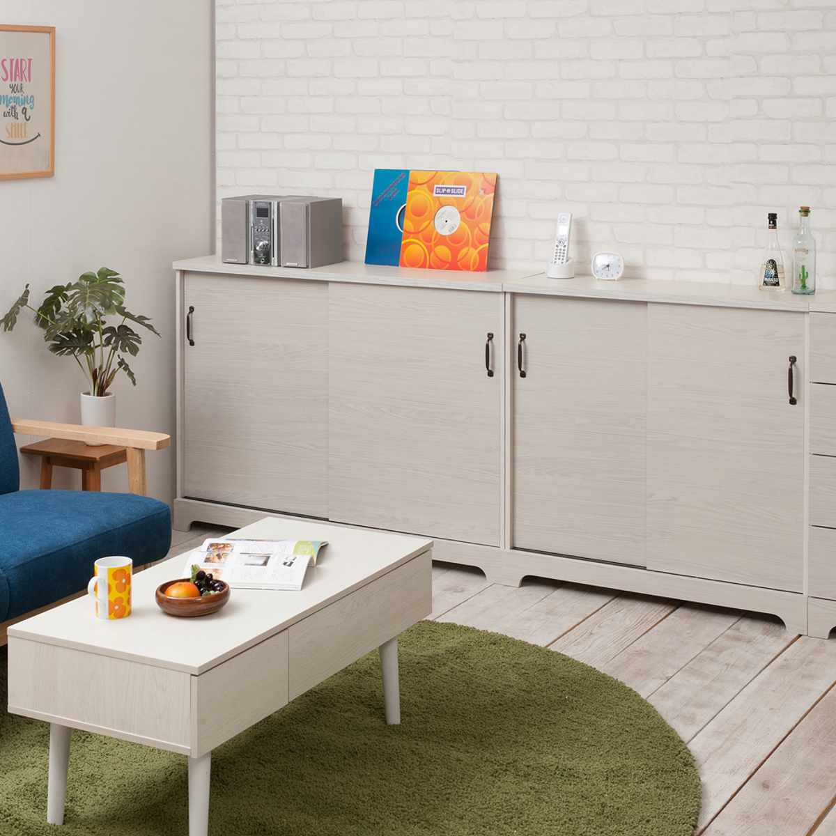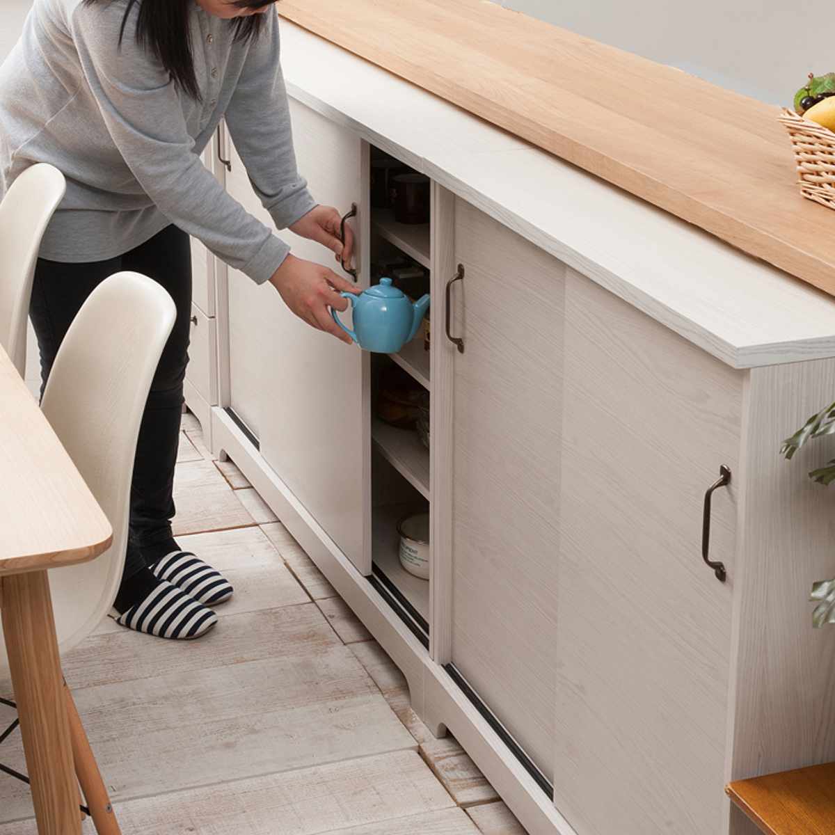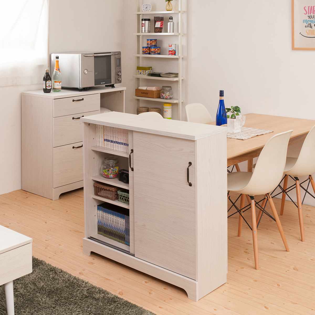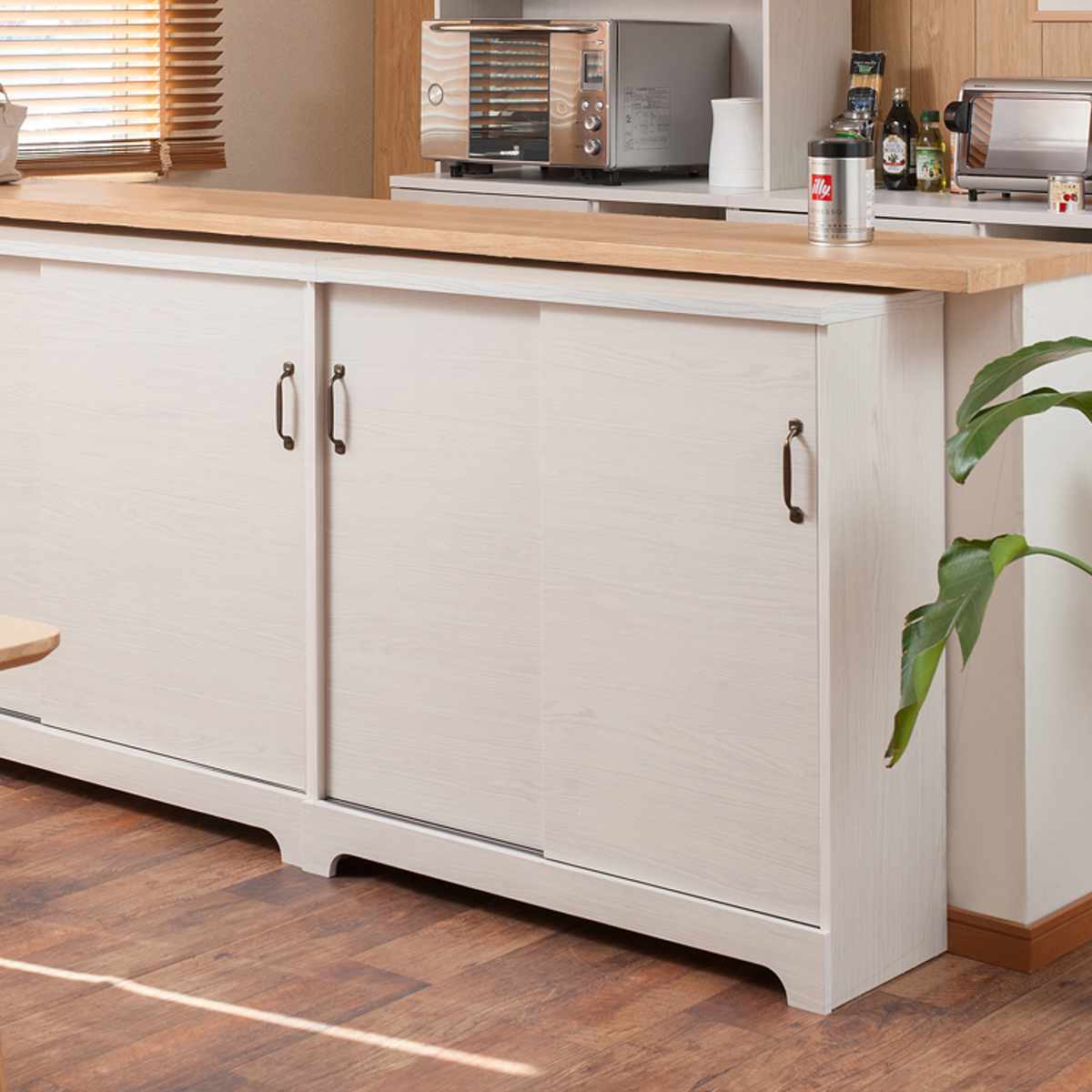 カウンター下収納 引き戸 キャビネット 幅90cm ホワイト木目 ( Late ラテ カウンター下 収納 可動棚 間仕切り 食器棚 ラック 棚 背面化粧 リビング ホワイト 白 )
