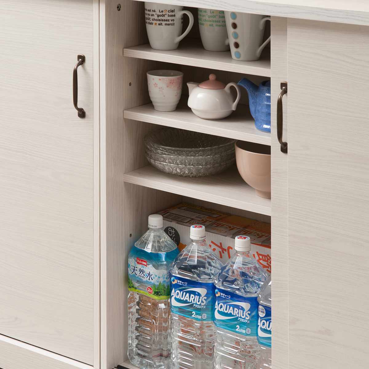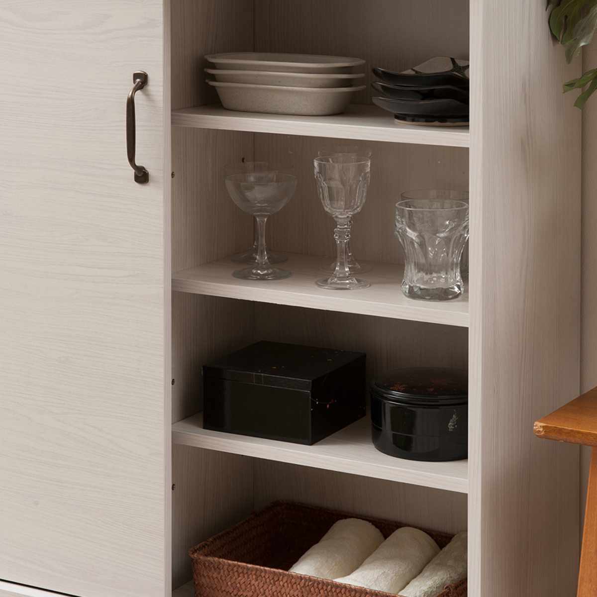 真ん中の固定棚以外は棚板が動かせるので、収納物に合わせて高さを調整していただけます。リビングでごちゃつきがちな小物類や、カトラリーやラップ、レトルト食品などキッチン周りのさまざまな物をスッキリ整理整頓でき、大変便利です。