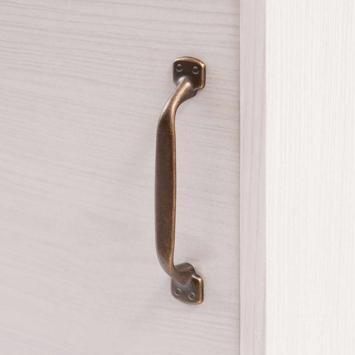 重厚感のある取っ手は持ちやすく、開け閉めもしやすいです。鉄製にゴールドをいぶしたような焼付け塗装で仕上げ、木目にぴったりと合うデザインです。