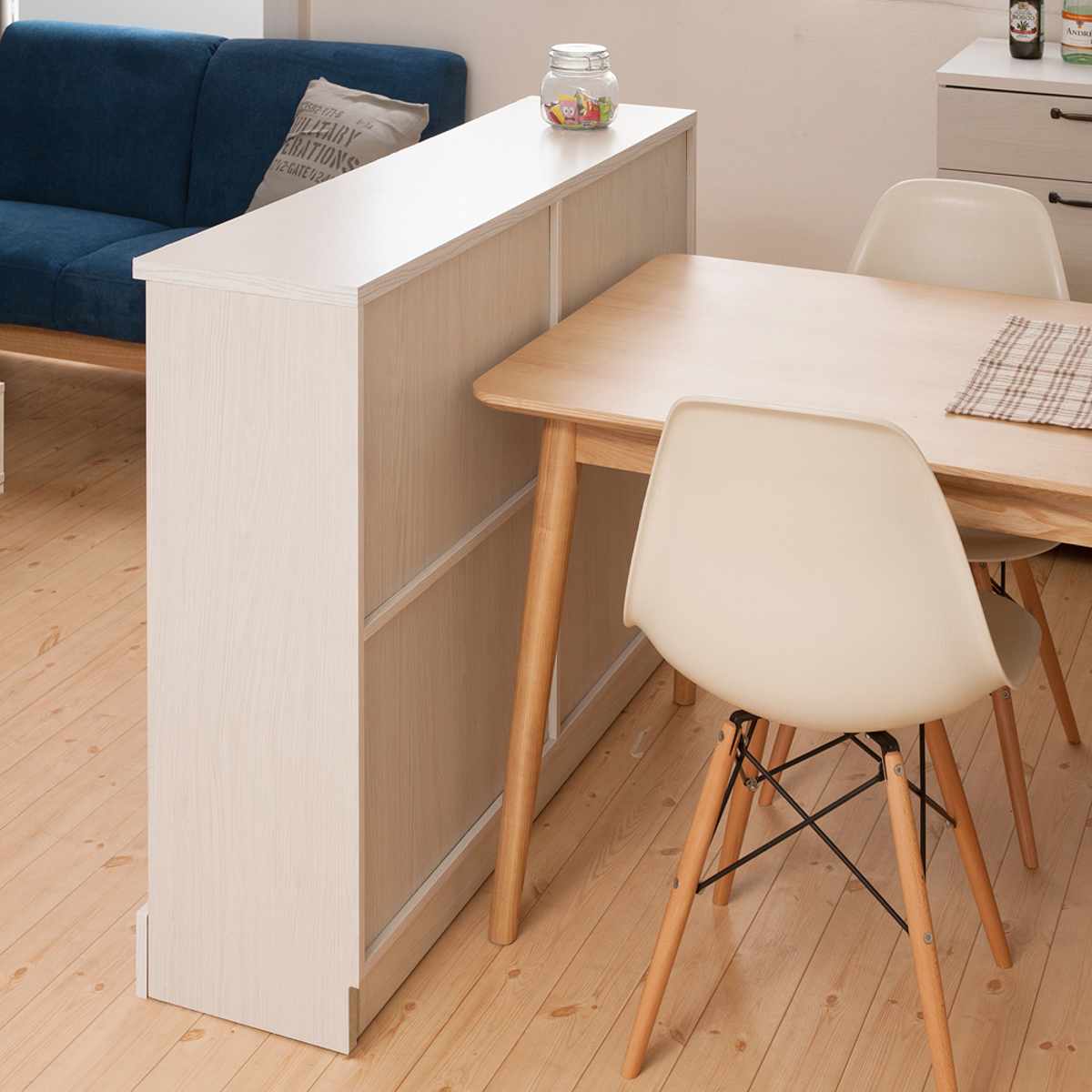 背面化粧仕上げがされているので、どこから見ても美しく、置き場所を選びません。お部屋の中央に配置して、間仕切りとしてもお使いいただけます。