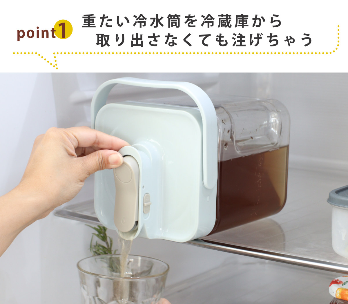 横置きも縦置きもできる冷水ポットです。冷蔵庫で横置きのまま注げるので、わざわざ重たい冷水筒を冷蔵庫から取り出さなくても注ぐことができます。小さなお子さまでも自分で入れやすいので、留守番中でも安心して使えます。