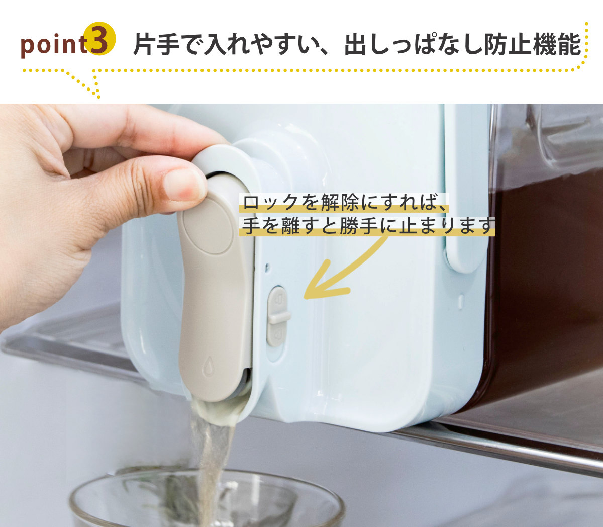 注ぎ口にはロック機能が付いています。給水ボタン押してからロックすれば手を放しても出しっぱなしにすることができます。ロックを解除している時は、押している時だけ飲み物が出て離すと勝手に止まり、片手で操作できます。出しすぎてしまう心配がないので、小さなお子様でも自分で注ぐことができます。