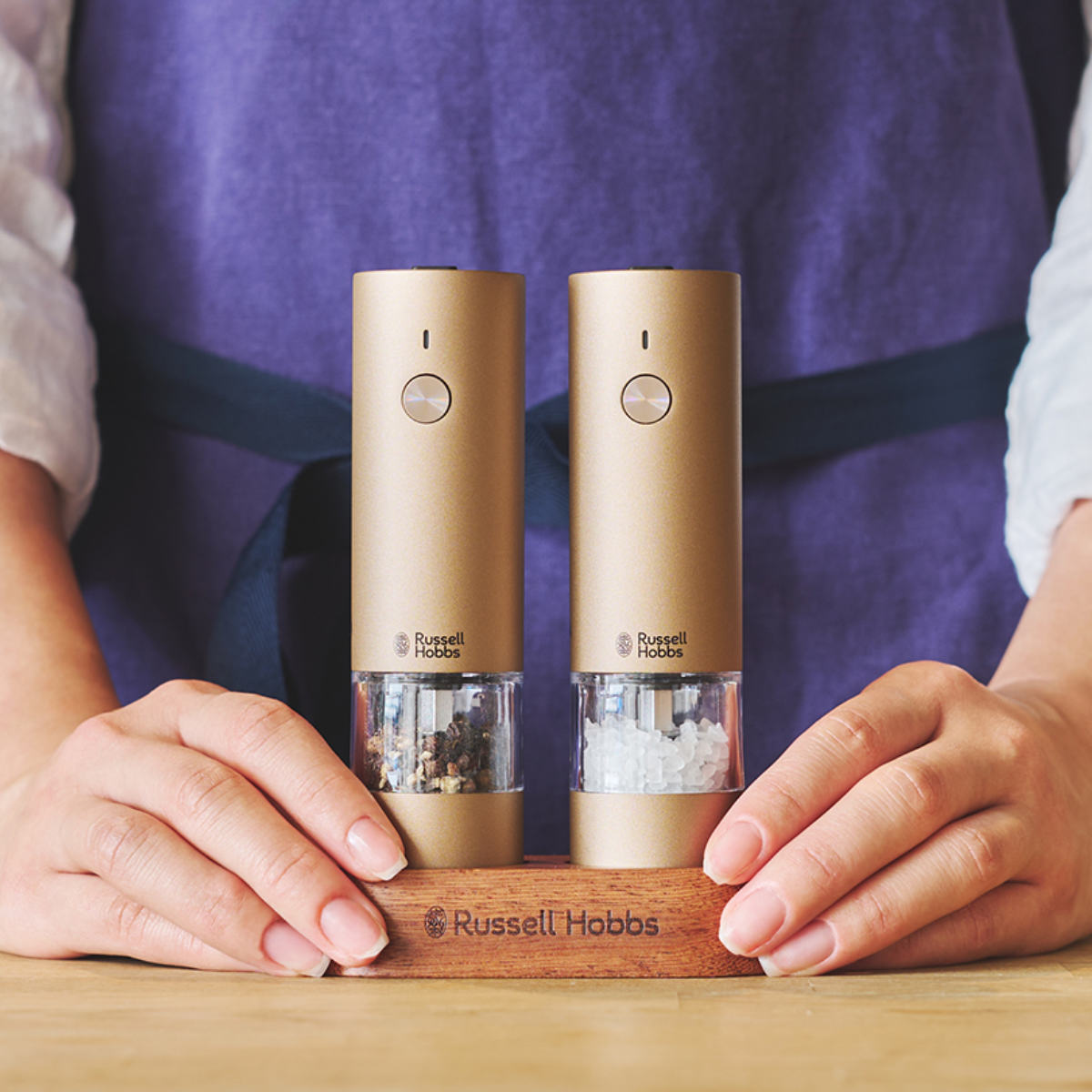 Russell Hobbs 充電式 電動ミル 2本セット ソルト&ペッパー ミニ 木台付き スパイスミル ( ラッセルホブス ミル USB ソルトミル ペッパーミル ワンプッシュ セラミック刃 ウッドスタンド付き 胡椒 岩塩 2本 ) 【ブラウンゴールド】