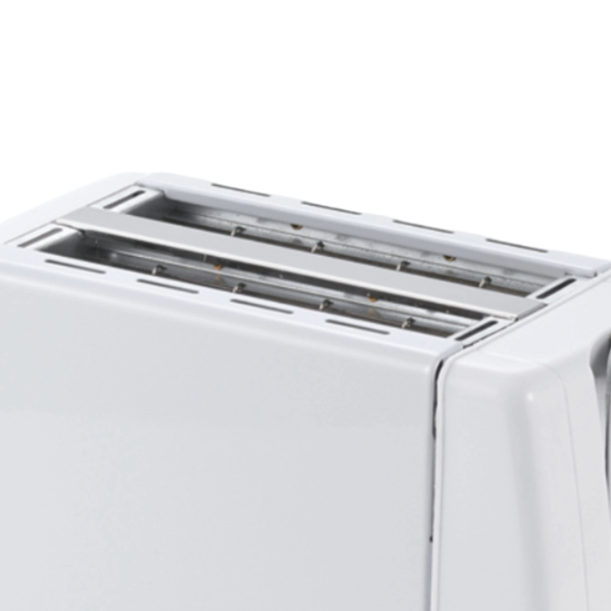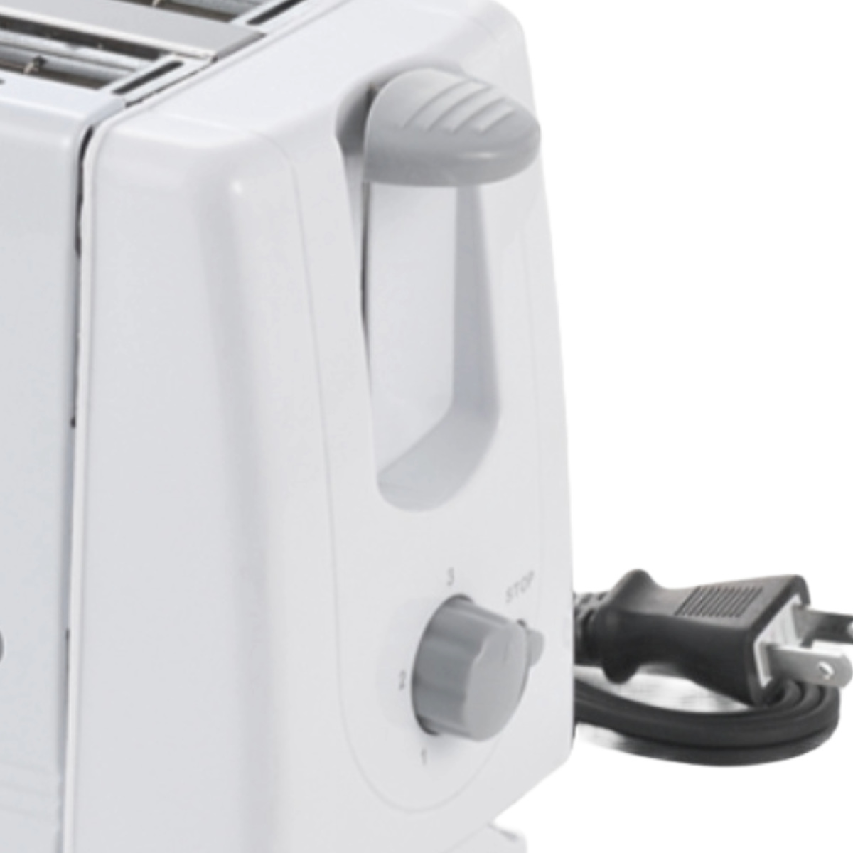 焼きムラもなく、ふっくらこんがり焼けて、焼きあがると、パンが飛び出すポップアップ式のトースターです。清潔感のあるホワイトカラーにシンプルなデザイン。