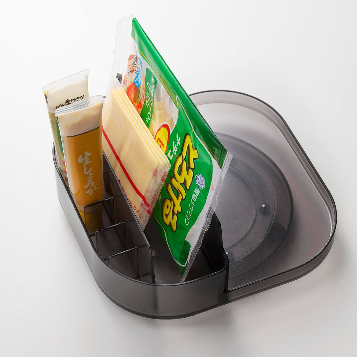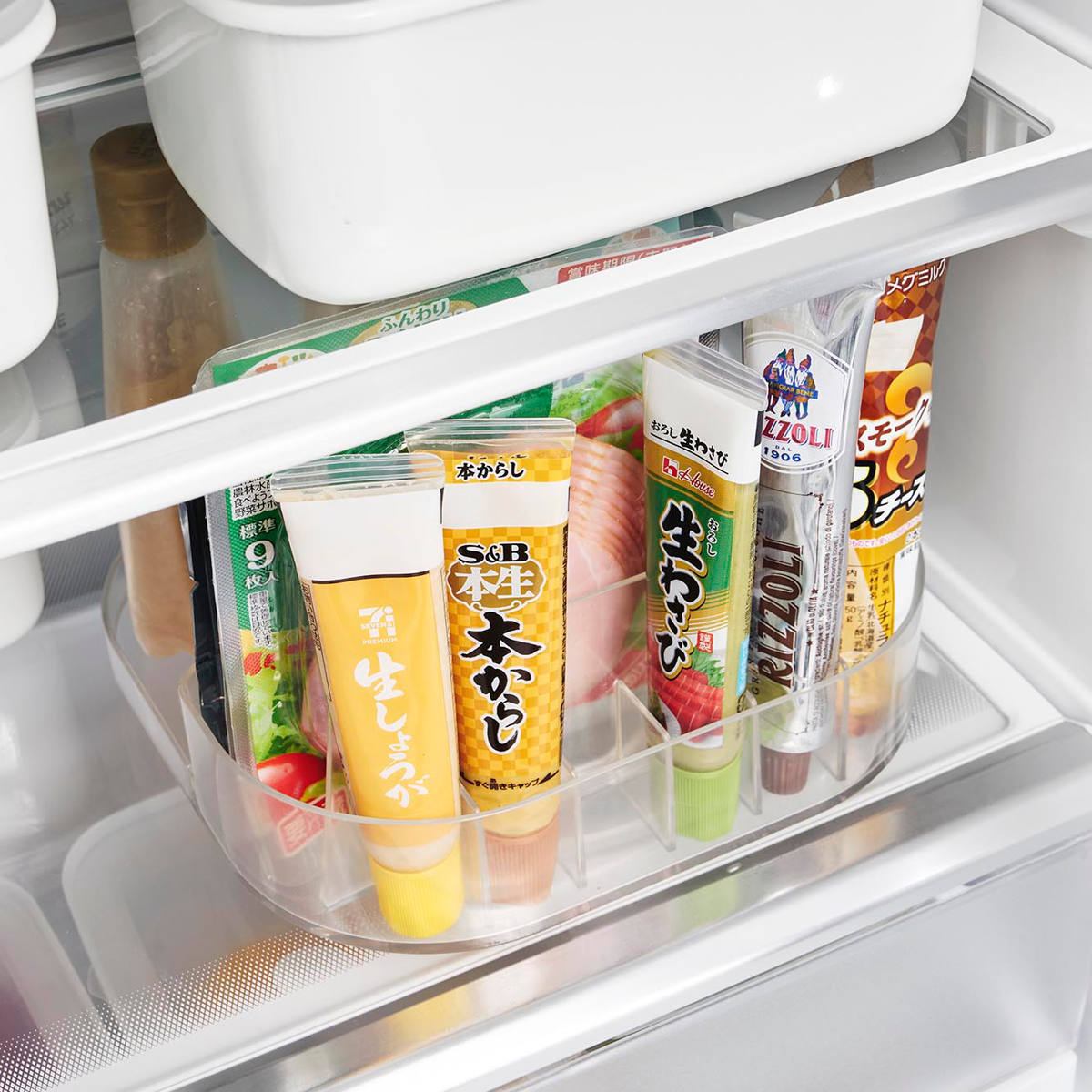 調味料やジャムの瓶などをまとめてすっきり整頓できる冷蔵庫用の収納トレーです。薄い物やチューブ類が整理しやすい仕切り付きです。