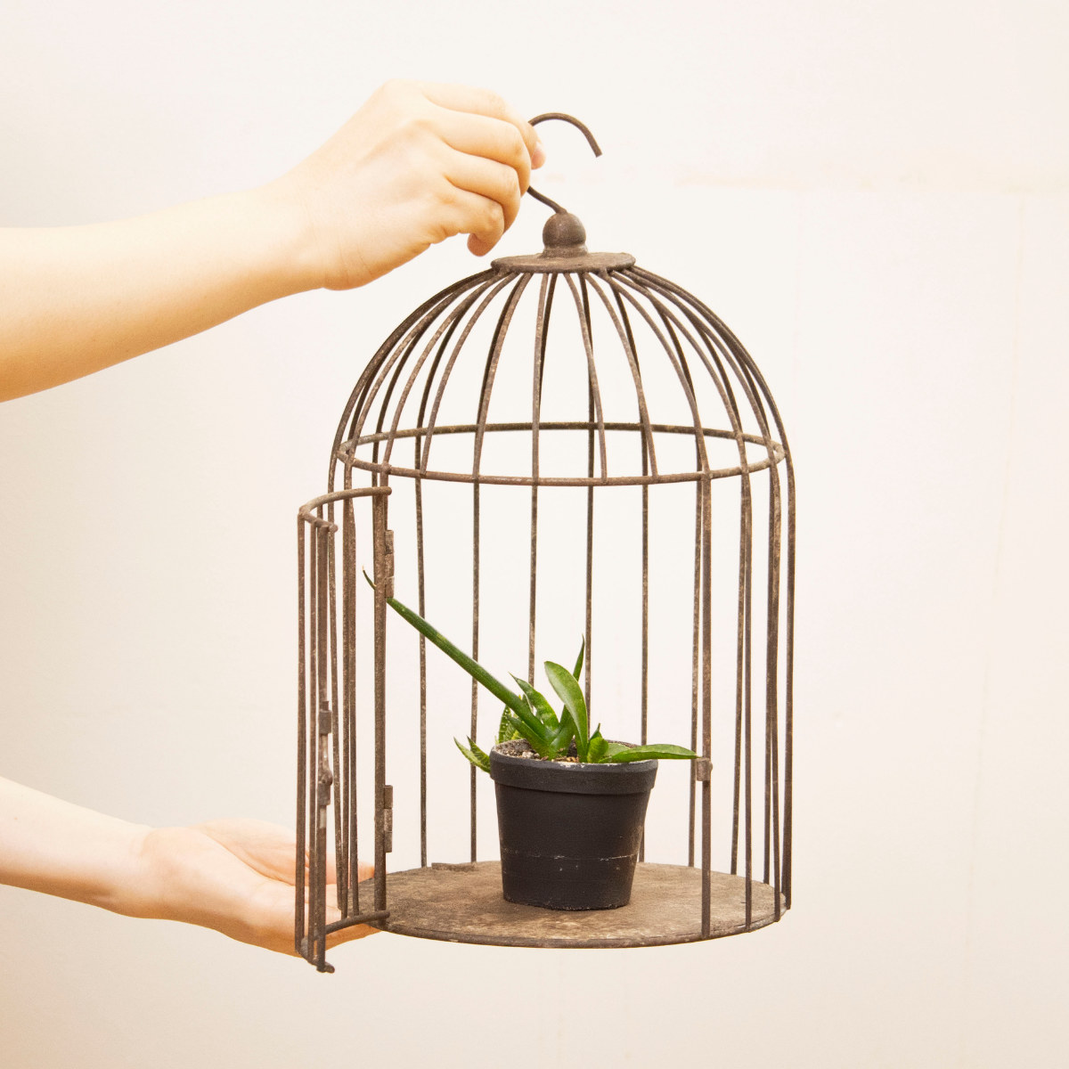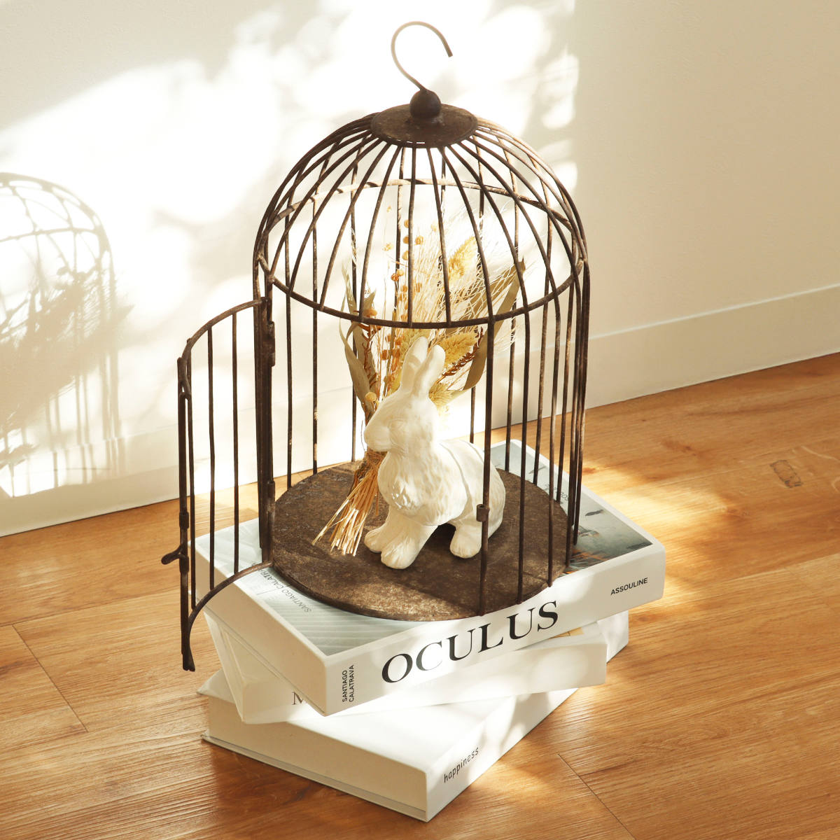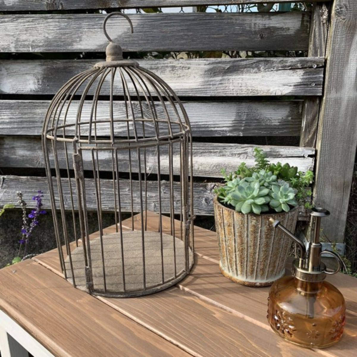 鳥かごの形をしたハンギングプランターです。サビ加工やざらつきなどのヴィンテージ加工が施され、長い年月を経たような味わい深さとカッコ良さが特徴です。シンプルな形とヴィンテージ調デザインがお洒落なジャンクガーデンを演出します。