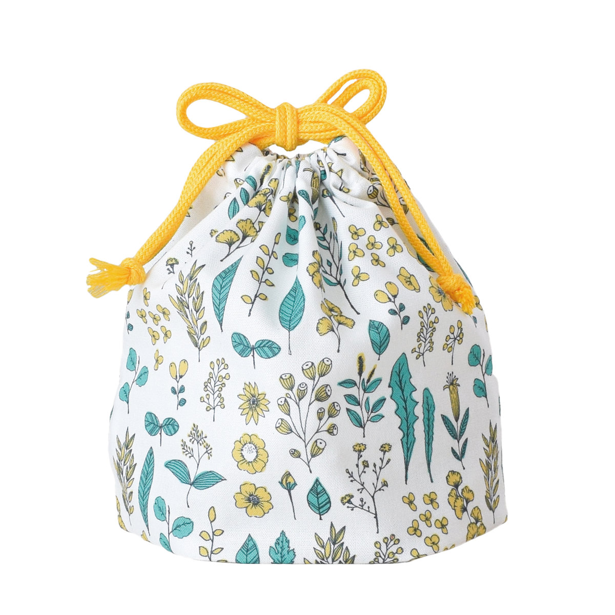 ころんとした丸いシルエットと大人っぽいデザインがかわいい、小さなランチ巾着です。花々や草木をモチーフにした線画風のイラストと甘くないカラーリングが魅力で、ランチタイムに華やかにしてくれます。おにぎりケースの持ち運びにぴったりなサイズです。