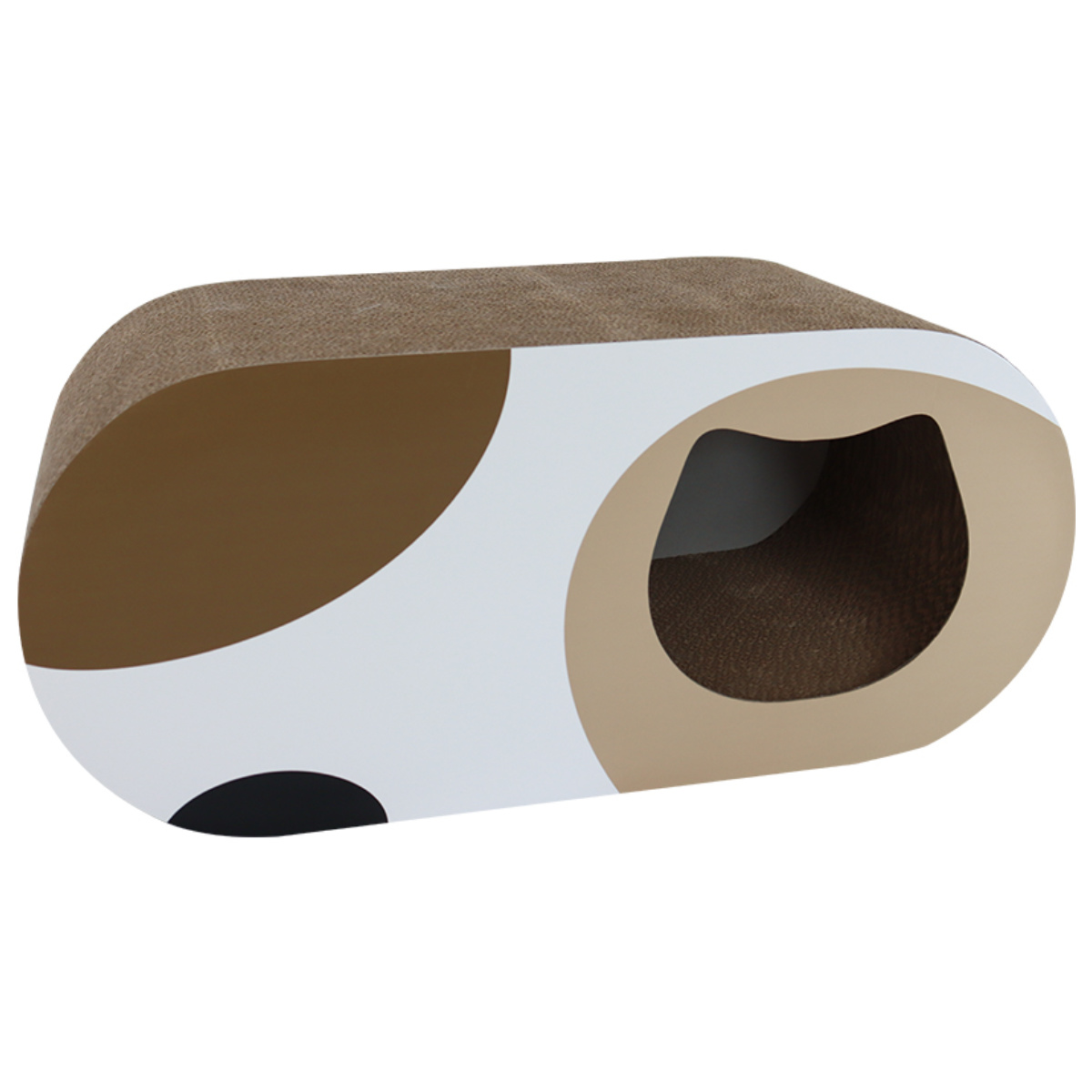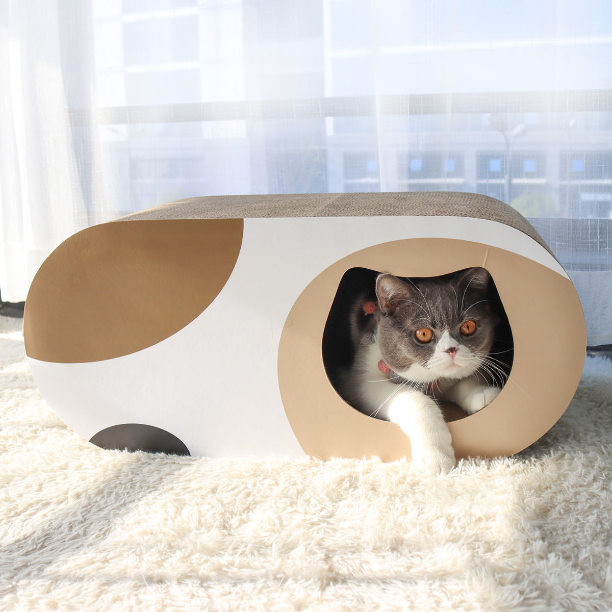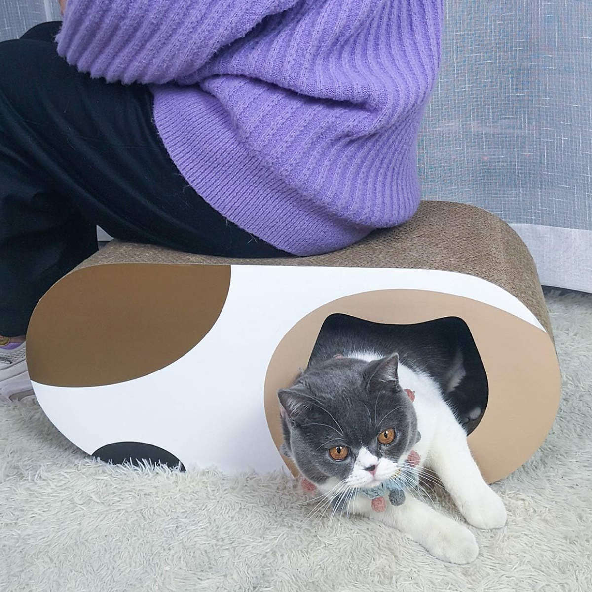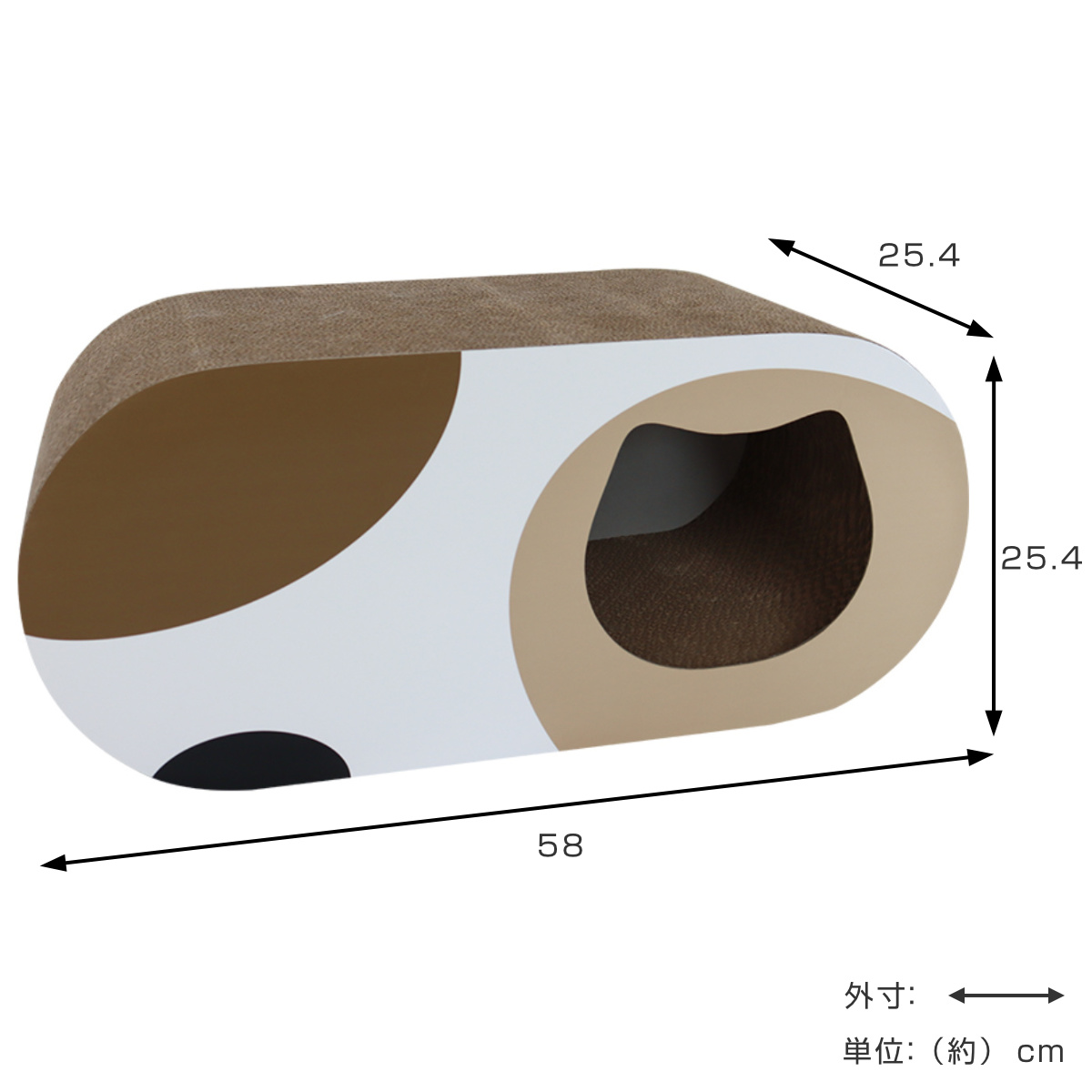 猫型の二か所の入り口から自由に出入りができる、トンネル型の爪とぎです。爪とぎとしてはもちろん、くぐって遊んだり、くつろぎスペースにしたりと、楽しく快適に過ごすことができます。複数の猫が一緒に遊んだりくつろぐことができるので、多頭飼いのご家庭にもおすすめです。