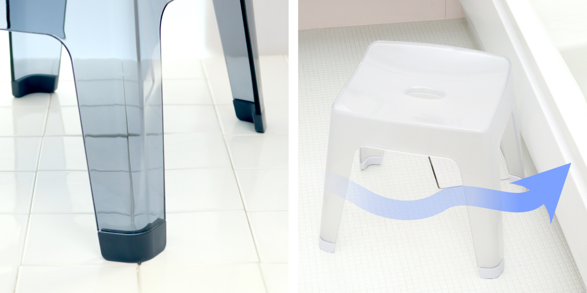 | 浴槽に掛けて乾燥&収納 浴槽に掛けて乾燥でき衛生的です。省スペースで収納にも困りません。 | 持ち運びラクラク 座面の穴が広めの設計で持ち運びしやすく、掃除のときの移動も簡単です。 |