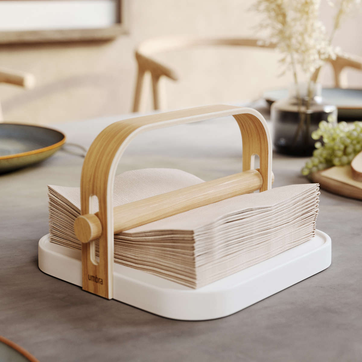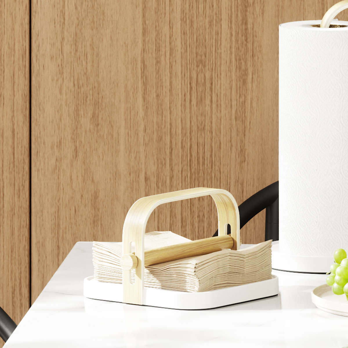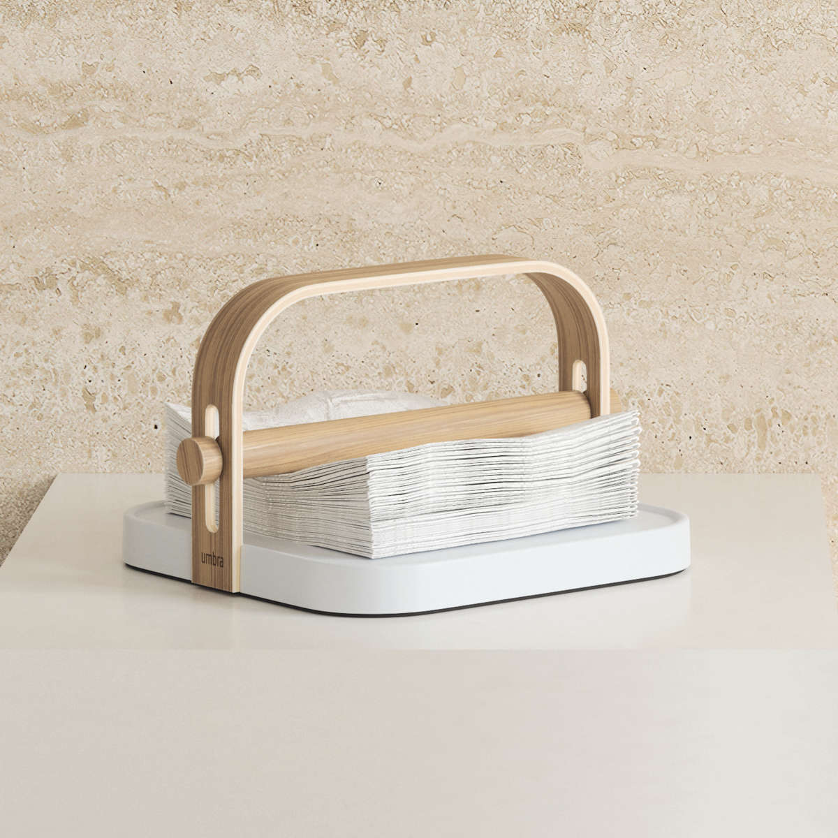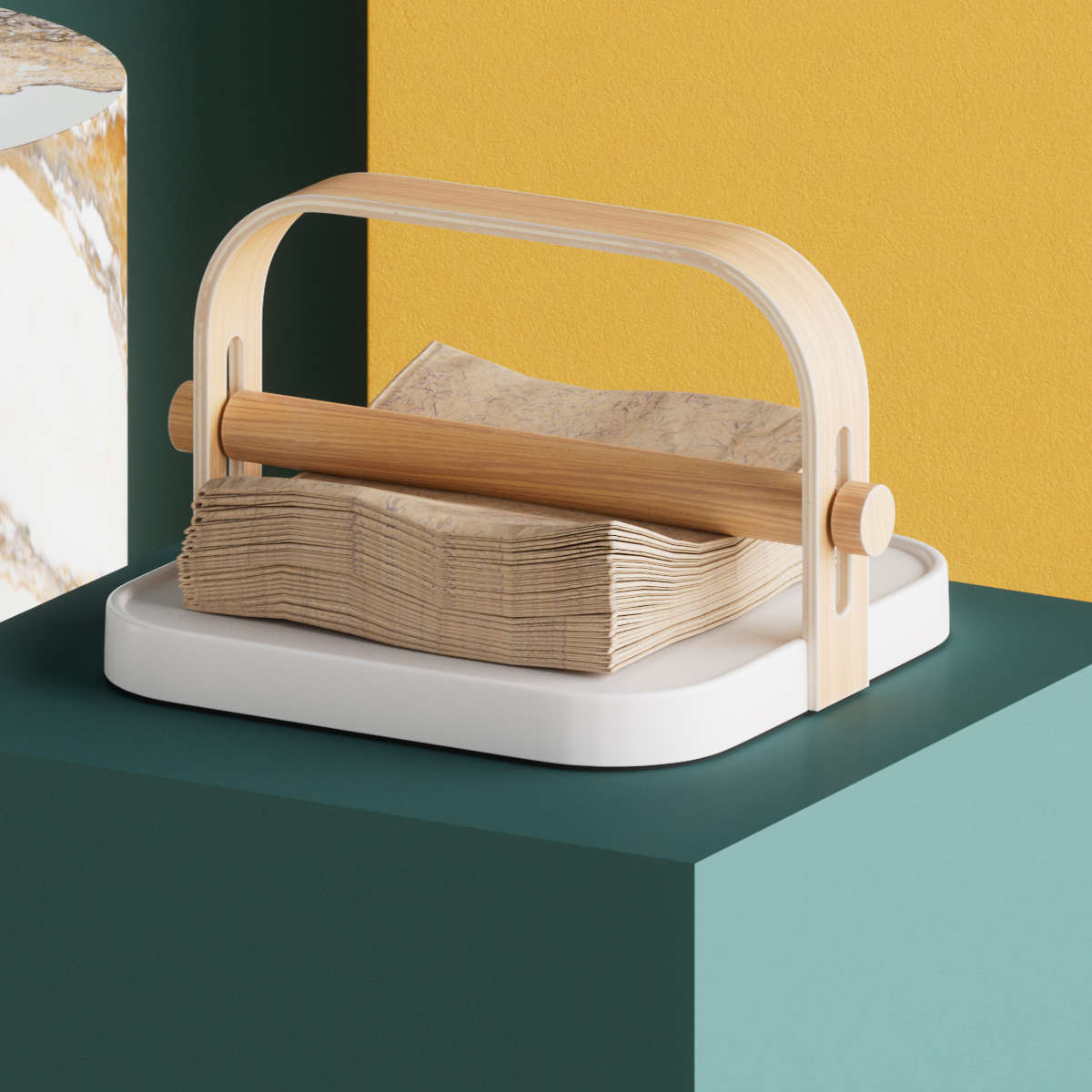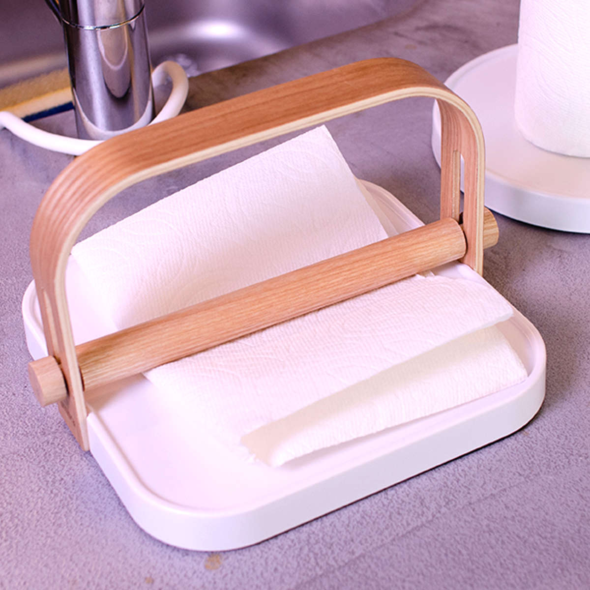 ホワイト×アッシュウッドの配色がナチュラルでオシャレなナプキンホルダーです。しっかり太めのハンドル付きなので、お部屋での移動はもちろん、庭でバーベキューをする時や、お子様とピクニックをする時などぱっと外に持ち運べて便利です。バーがしっかりペーパーを押さえてくれるので、風に飛ばされにくいです。