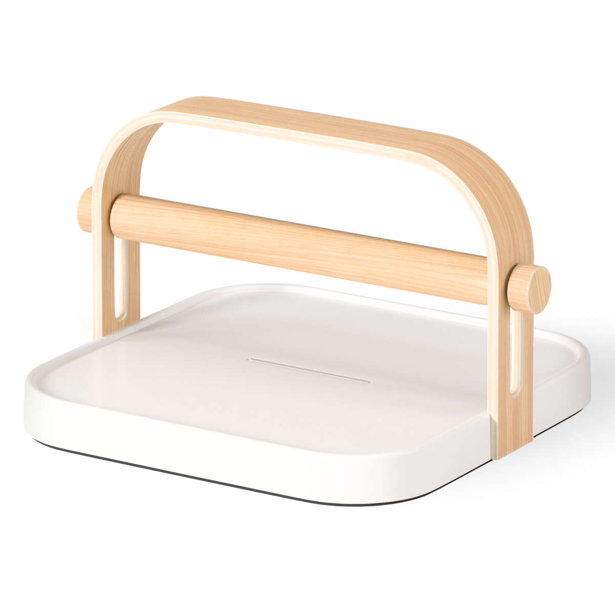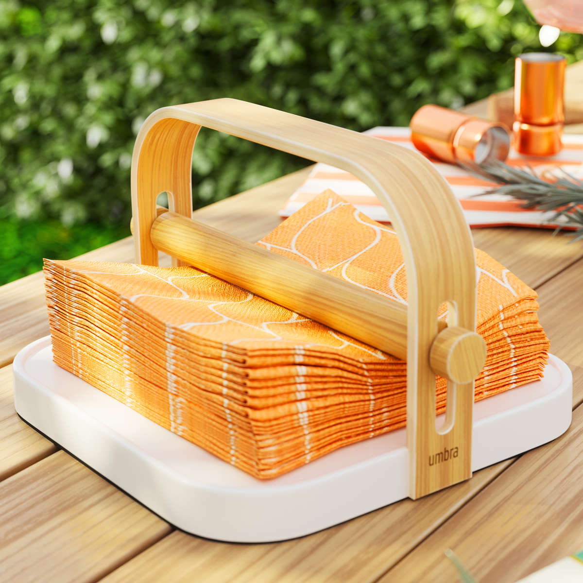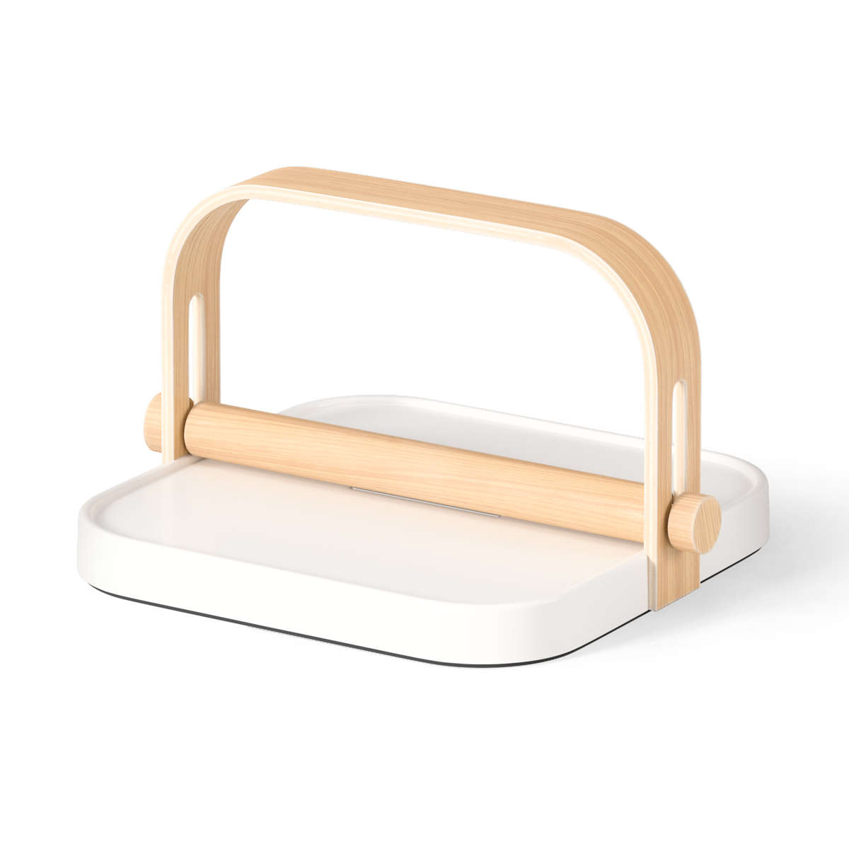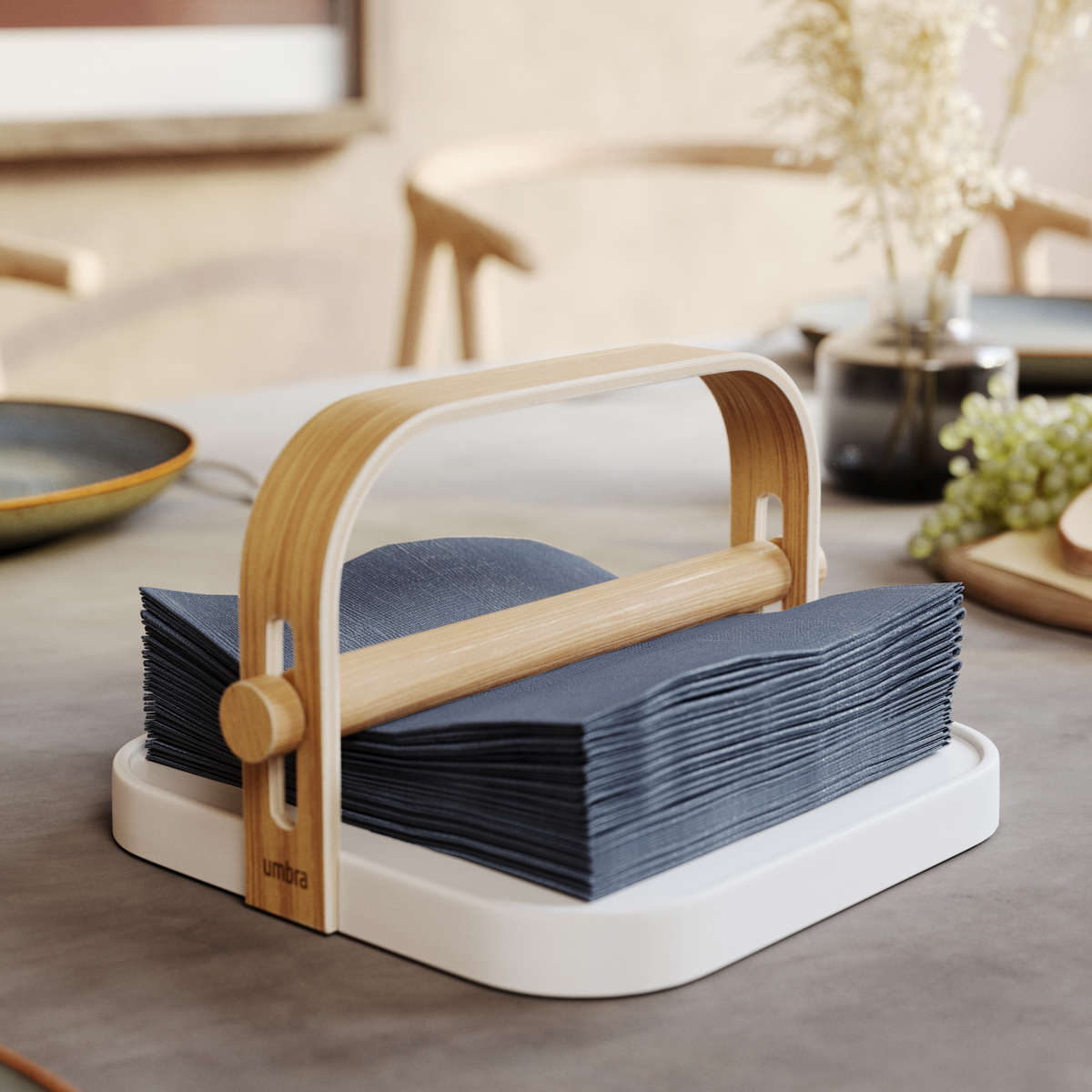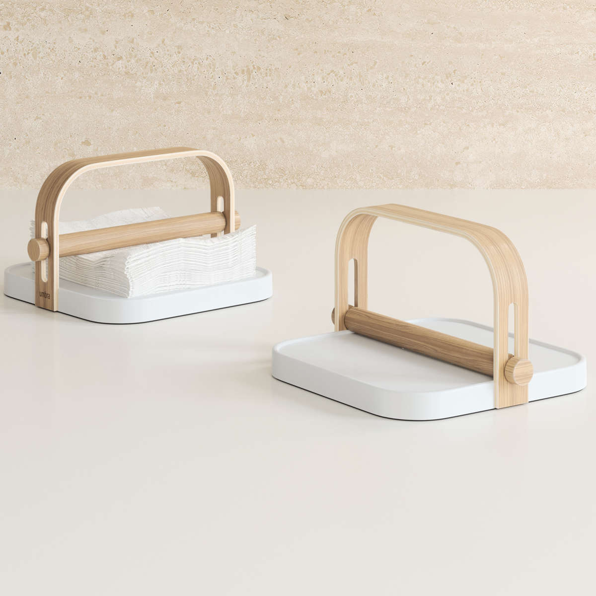 ホワイト×アッシュウッドの配色がナチュラルでオシャレなナプキンホルダーです。しっかり太めのハンドル付きなので、お部屋での移動はもちろん、庭でバーベキューをする時や、お子様とピクニックをする時などぱっと外に持ち運べて便利です。バーがしっかりペーパーを押さえてくれるので、風に飛ばされにくいです。