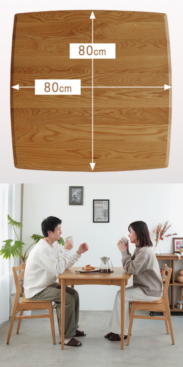 天板は正方形で80cmとコンパクトながら2人でゆったり使えます。