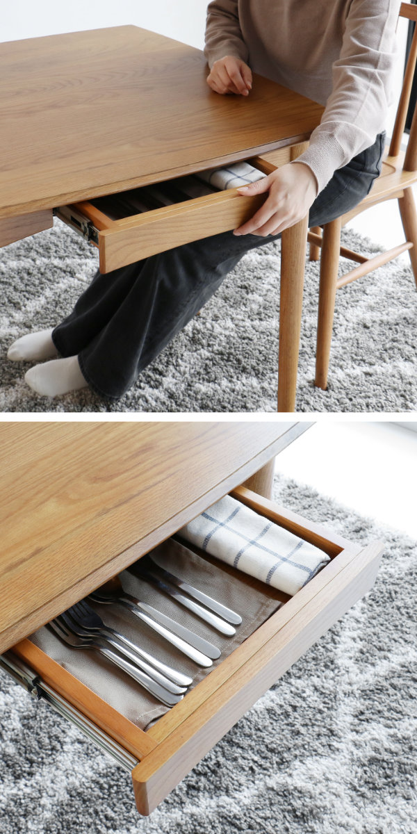 幕板部分には引出しが付いています。カトラリーや新聞など、ダイニングで散らかりがちな小物の収納に便利です。
